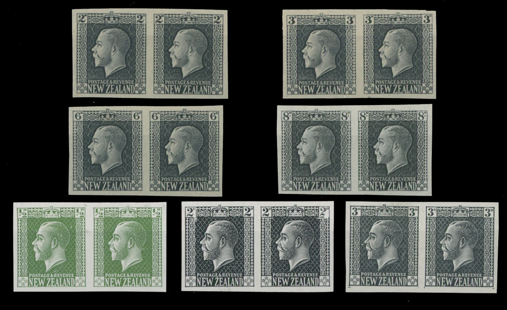 1915-19, King George V, seven horizontal pairs of imperforate plate proofs, including engraved printing of 2p, 3p, 6p and 8p, all are in black; typo printing of ½p green, 2p and 3p in black, full OG (1) or no gum as issued, NH, VF, Est. $400-$500, Scott #144/64