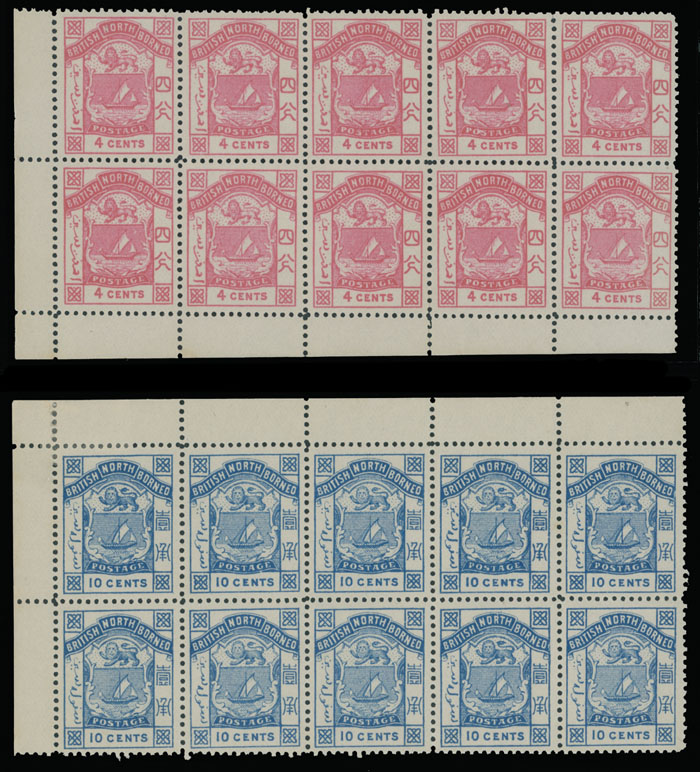 1886-87, Coat of Arms with text at top ”British North Borneo”, 4c pink and 10c blue, perforation 14, corner sheet margin blocks of ten (5×2), full OG, NH (one stamp of 10c block is hinged), VF, C.v. $215++, SG #26, 28,C.v.£255 as hinged singles, Est. $150-$180, Scott #28, 30