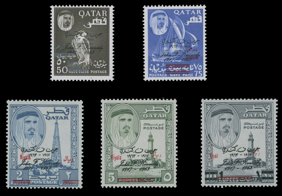 1966, gray or red bilingual currency name change overprint over Kennedy overprints/surcharge on Falcon, Dhow and Oil Derrick. 50d/50np. 75d/75np, 1r on 1ru/10ru, 2r/2ru and 5r/5ru, complete set of five, full OG, NH, VF and scarce, C.v. $390, SG #146/150, C.v. £695, Est. $200-$250, Scott #111- 111D