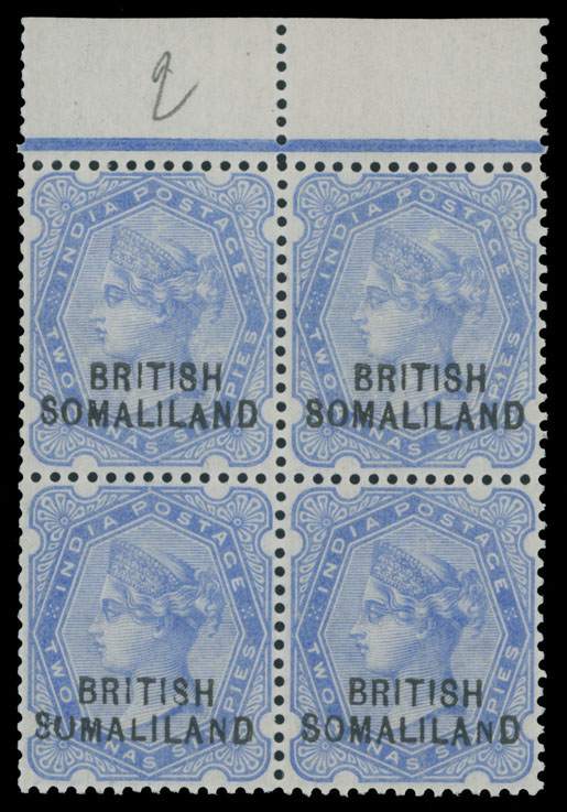 1903, Queen Victoria, ”British Somaliland” overprint at the bottom of India stamp of 2½a ultra, top sheet margin block of four, lower left stamp has ”SUMALILAND” variety, full OG, NH, VF, C.v.$295 as singles, SG #18, b, C.v. £276 as hinged singles, Est. $300-$350, Scott #14, f