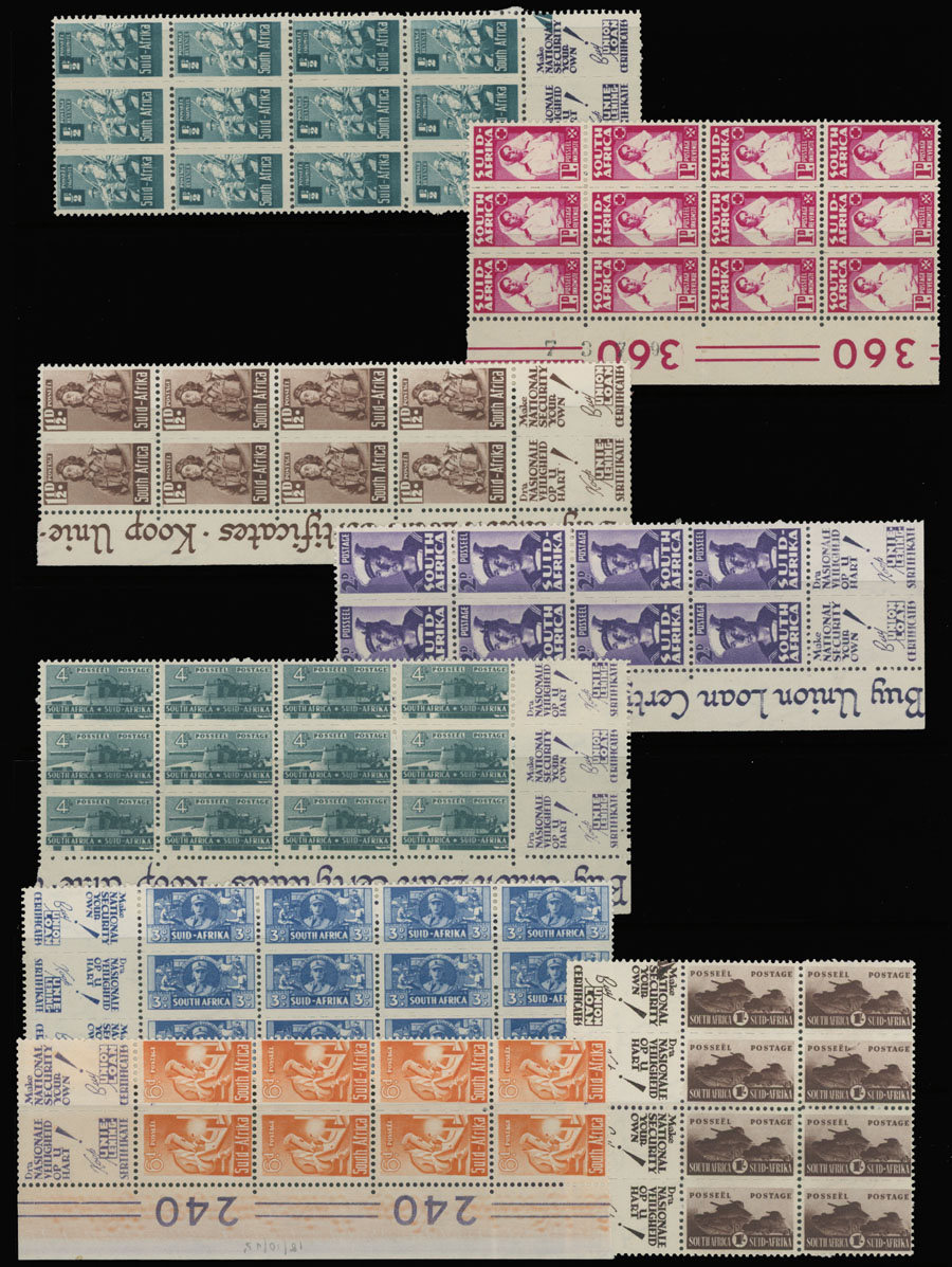 1942-43, War issue, ½p-1s, small format stamps in pairs or strips of three, all are in blocks of 4 with marginal imprint, one stamp in 1s block has Smoking ”L” variety, full OG, NH, VF, SG #97/104, 104b, C.v. £295++, Est. $150-$180 , Scott #90-97