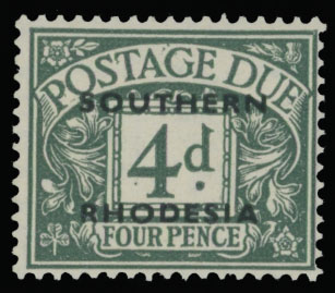 1951, black overprint ”Southern Rhodesia” on postage due stamp of GB 4p dull gray green, full OG, fine and scarce, C.v. $275, SG #D6, C.v. £300, Est. $150-$180 , Scott #J5a