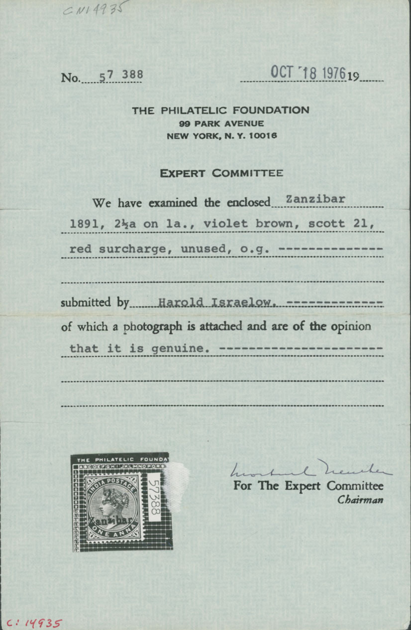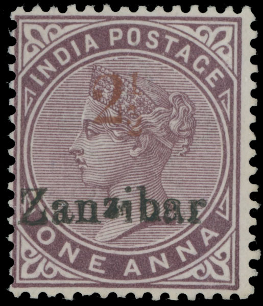 1896, red surcharge (type a or SG type 3) 2½a over black ”Zanzibar” overprint on 1a violet brown, small ”z” variety of overprint, a beautiful stamp, full OG, NH, F/VF, PF certificate, C.v. $275++, SG #32, C.v. £250 as hinged, Est. $200-$250, Scott #21