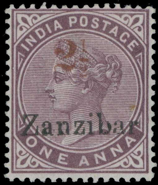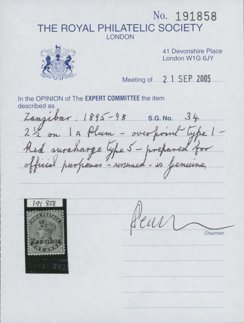 1896, red surcharge (type c or SG type 5) 2½a over black ”Zanzibar” overprint on 1a violet brown, nicely centered and post office fresh, full OG, NH, VF, RPS certificate, C.v. $310++, SG #34, C.v. £300 as hinged, Est. $300-$350 , Scott #23