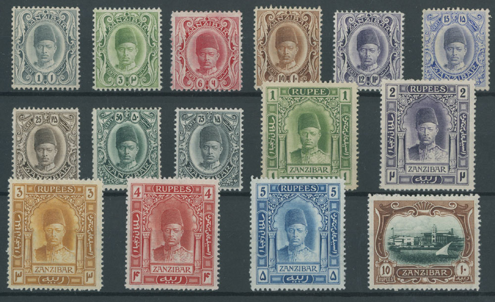 1908-09, Sultan Ali bin Hamoud and Palace of the Sultan, 1c-10r, complete set of 15, printed on watermarked Multiple Rosettes paper, strong fresh colors, full OG, NH, VF, C.v. $632++, SG #225/39, C.v. £600 as hinged, Est. $700-$800 , Scott #99-113