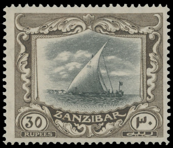 1913, Dhow, 30r dark brown and black, sideways watermark Multiple Rosettes, full OG, NH, F/VF, C.v. $425++, SG #260c, C.v. £475 as hinged, Est. $450-$500 , Scott #136