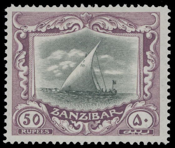 1913, Dhow, 50r purple and black, sideways watermark Multiple Rosettes, full OG, NH, VF, C.v. $800++, SG #260d, C.v. £800 as hinged, Est. $800-$900 , Scott #138