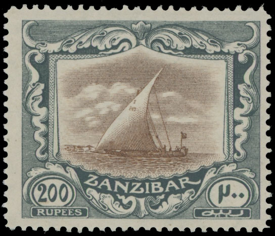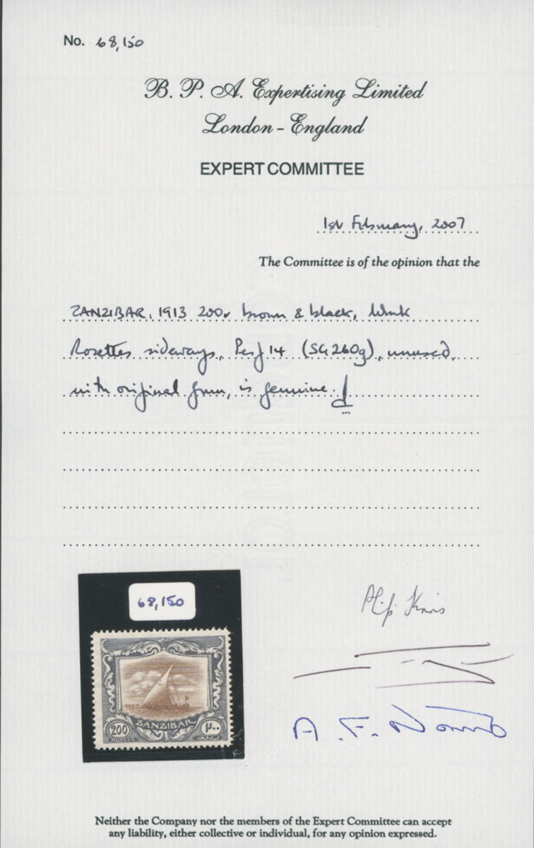 1913, Dhow, 200r black and brown, sideways watermark Multiple Rosettes, fresh condition, full OG, NH, close to VF and rare, BPA certificate, C.v. $1,500++, SG #260g, C.v. £1,800 as hinged, Est. $1,800-$2,000 , Scott #140