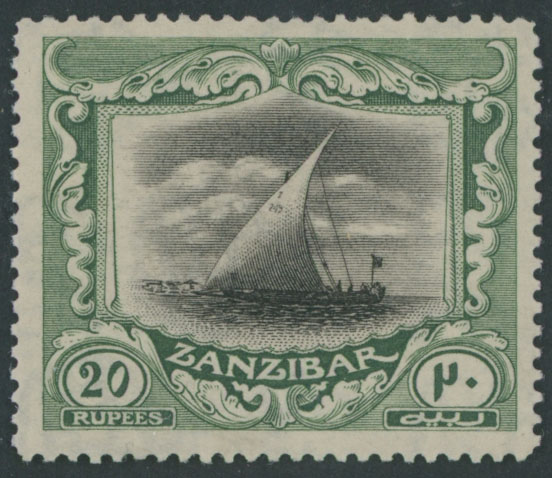 1921-29, Dhow, 20r yellow green and black, sideways watermark Multiple Script CA, full OG, NH, VF, C.v. $450+ +, SG #296, C.v. £450 as hinged, Est. $450-$500 , Scott #176