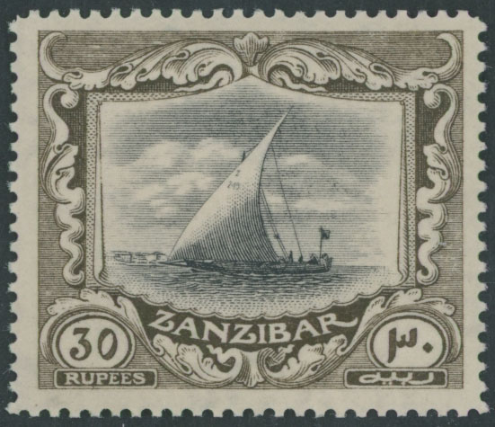 1929, Dhow, 30r dark brown and black, sideways watermark Multiple Script CA, full OG, NH, VF, C.v. $350+ +, SG #297, C.v. £400 as hinged, Est. $400-$450 , Scott #177