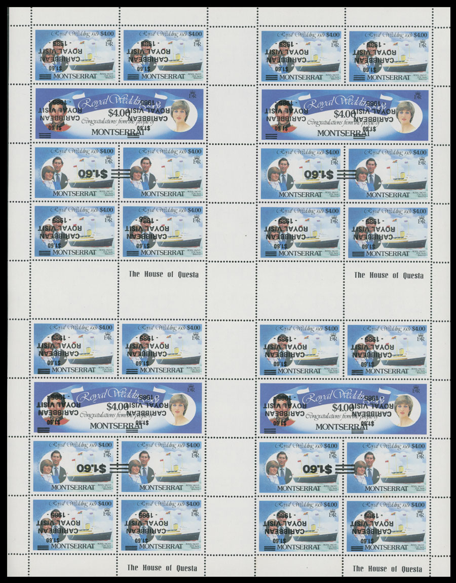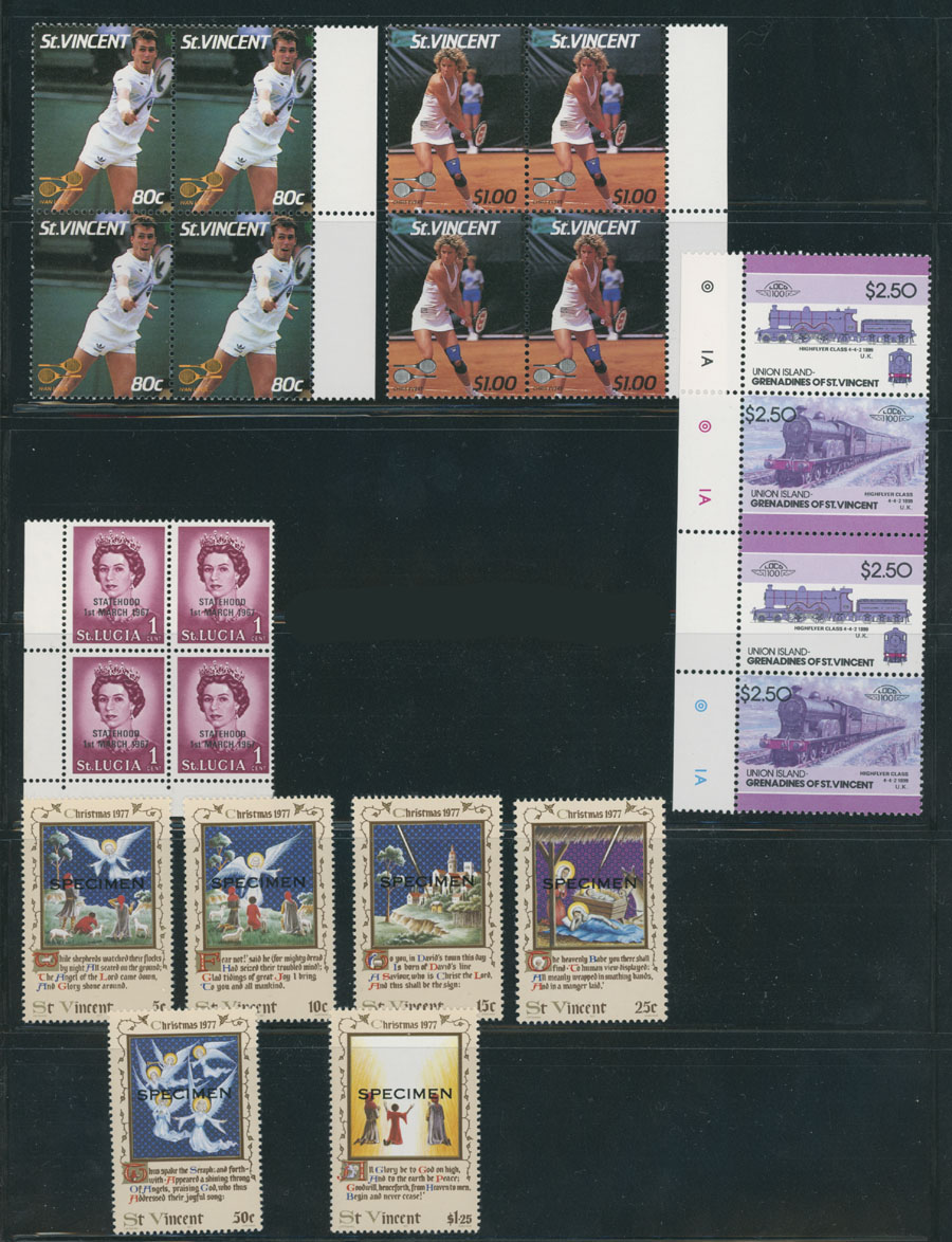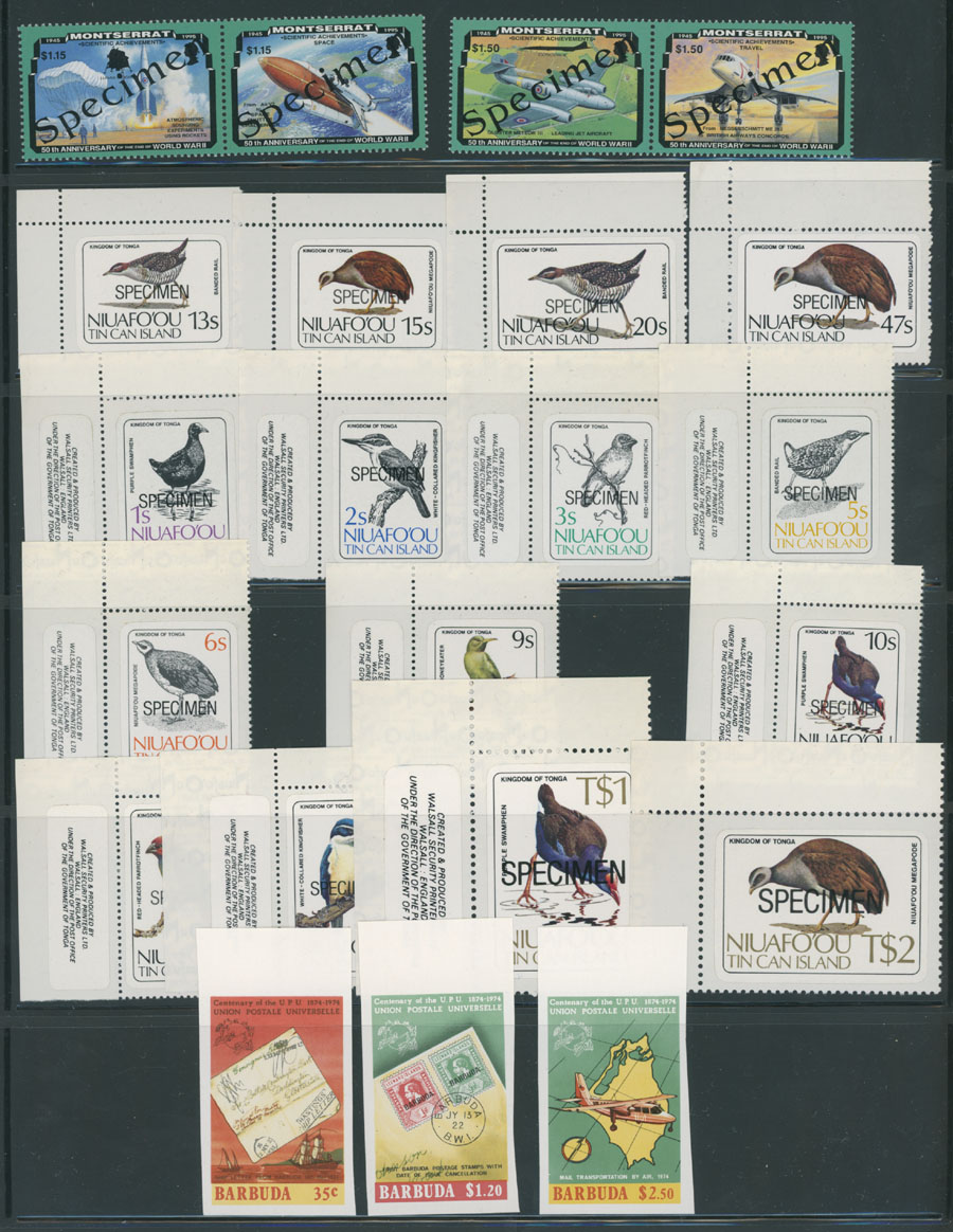 MODERN SPECIMEN AND ERRORS SELECTION: 1967-85, 154 mint never hinged stamps, representing nine issues, imperf Barbuda set, Niuafoou Birds with ”Specimen” overprint, Montserrat – two complete sheets of 25 or 28 with inverted overprint or surcharge, other varieties, including St. Vincent Tennis with missing balls, Virgin Islands – two stamps with missing colors in sheets of 25 and etc., full OG, NH, VF and great unit for further retail, Est. $150-$200
