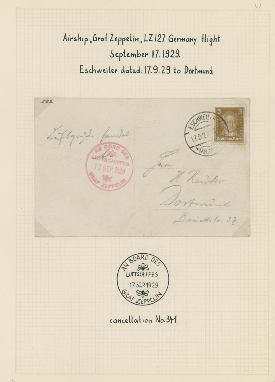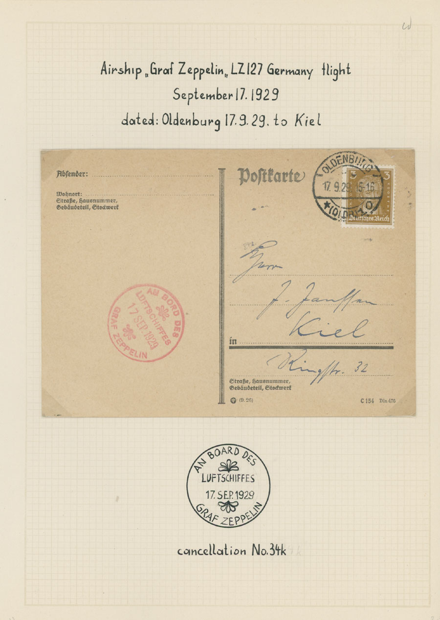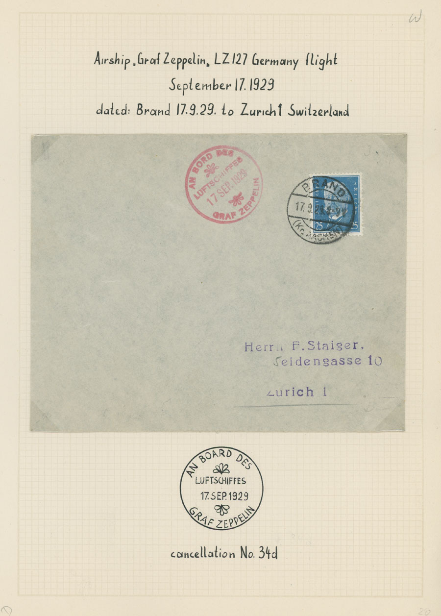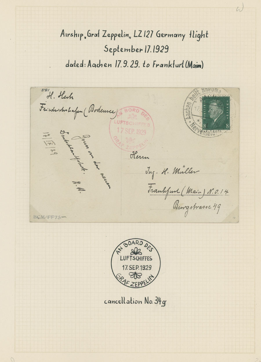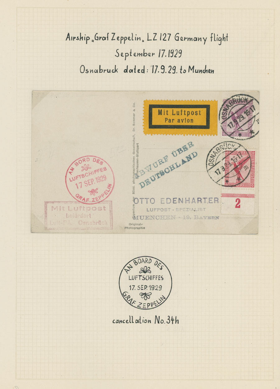 1929 (September 17), Germany Flight one cover and four postcards, properly franked and tied by the ”17.9.29” cancellations of Brand, Eschweiler, Aachen, Osnabruek and Oldenburg, each one with red on-board the same day markings, mounted on 5 pages from a Collection, VF and rare assemblage, Sieger #34d, f, g, h and k, C.v. €2,100, Est. $750-$800