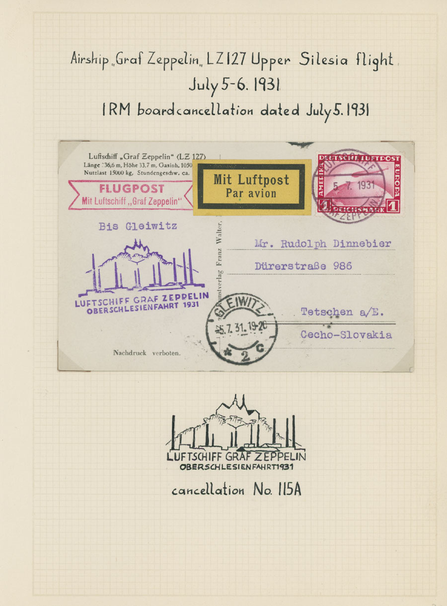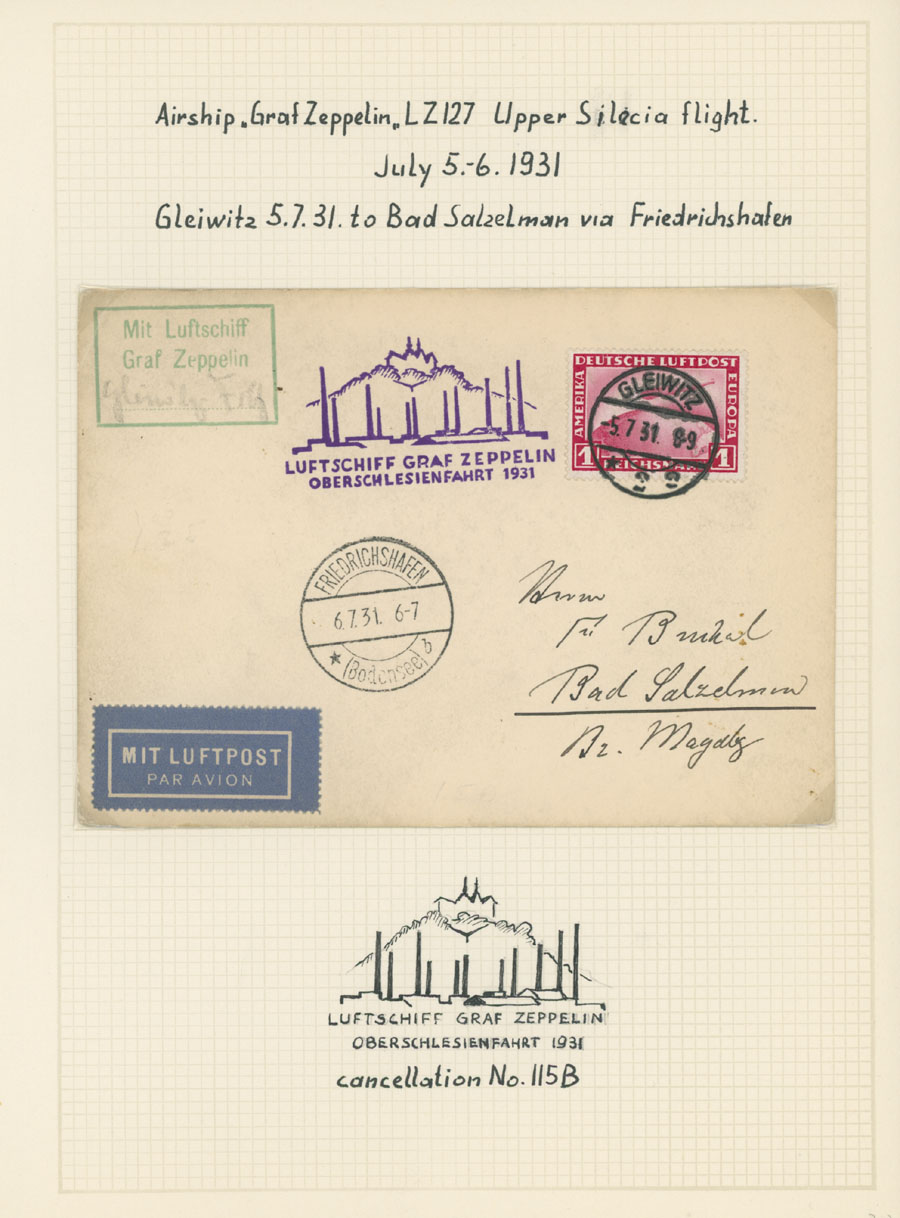 1931 (July 5-6), Upper Silesia Direct and Return Flight postcards, each franked by Zeppelin stamp of 1m carmine, tied by on-board or Glewitz ”5.7.1931” date stamps, violet confirmation and arrivals of Glewitz (5.7) and Friedrichshafen (6.7),arranged on two pages from a Collection, VF, Sieger #115Ab, Ba, Est. $200-$225, Scott #C35