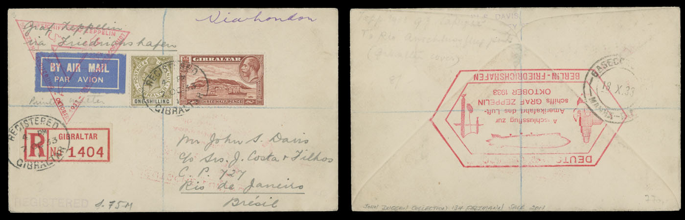 1933 (October 14-17), Chicago (Century of Progress) Flight registered cover to Brazil, delivered on leg Friedrichshafen – Recife, franked by two King George V adhesives, triangle confirmation marking on front and Berlin-Friedrichshafen connection on reverse, both in red, arrival ds, VF, Sieger #238A, C.v. €850, Est. $400-$450, Scott #84, 97