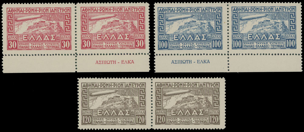 1933, Zeppelin issue, 30d, 100d and 120d, complete set of three in horizontal pairs, two with marginal imprint, full OG, NH, VF, C.v. $650, Est. $200-$250 , Scott #C5-7
