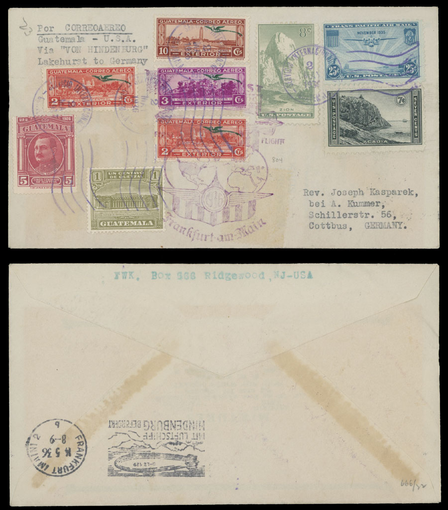 1936 (May 11-14), 1st North America Airship ”Hindenburg” Return Flight mixed franking cover from Guatemala, franked by six stamps, including four air post values, upon arrival to US uprated by three adhesives, special machine ”2.MAY.36” ds, violet American flight cachet, Frankfurt ”14.5.36” receiver, VF and rare, Sieger #409P, C.v. €1,650, Est. $700-$800, Scott #C48-49, C54