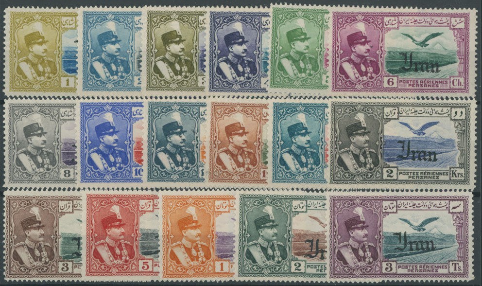 1935, Reza Shah Pahlavi and Eagle, black overprint ”Iran” on 1c-3t, complete set of 17, full OG, hinged, F/VF, C.v. $585, Est. $250-$300 , Scott #C51-67