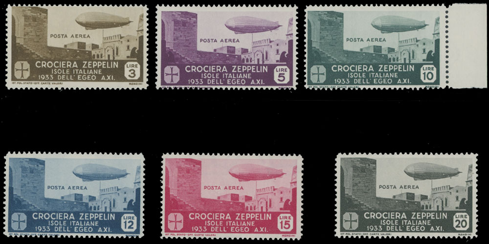 1933, Zeppelin issue, 3L- 20L, complete set of six, nice and post office fresh, full OG, NH, VF, C.v. $1,290, Sassone #PA22-27, C.v. €3,000, Est. $500-$600 , Scott #C20-25