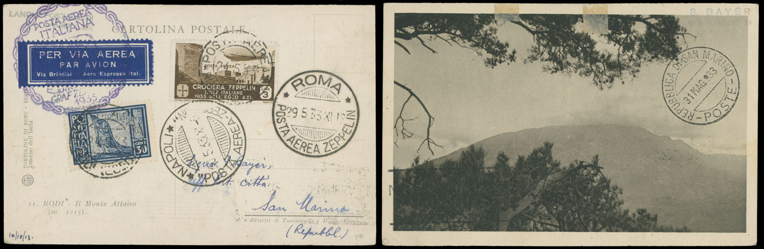 1933 (May 29-30), Italy Flight cover from Rhodes to San Marino, franked by Aegean Islands Zeppelin stamp of 3L olive brown and Rhodes 30c dark blue, tied by ”Rodi (Egeo) 24.5.33” ds, blue confirmation cachet, Rome ”29.V.33” connection and San Marino ”31.MAG.33” receiver on reverse, no Friedrichshafen arrival marking, Sieger #211A var, Sassone C.v. €750 for 3L stamp on correspondence, Est. $200-$250, Scott #59, C20