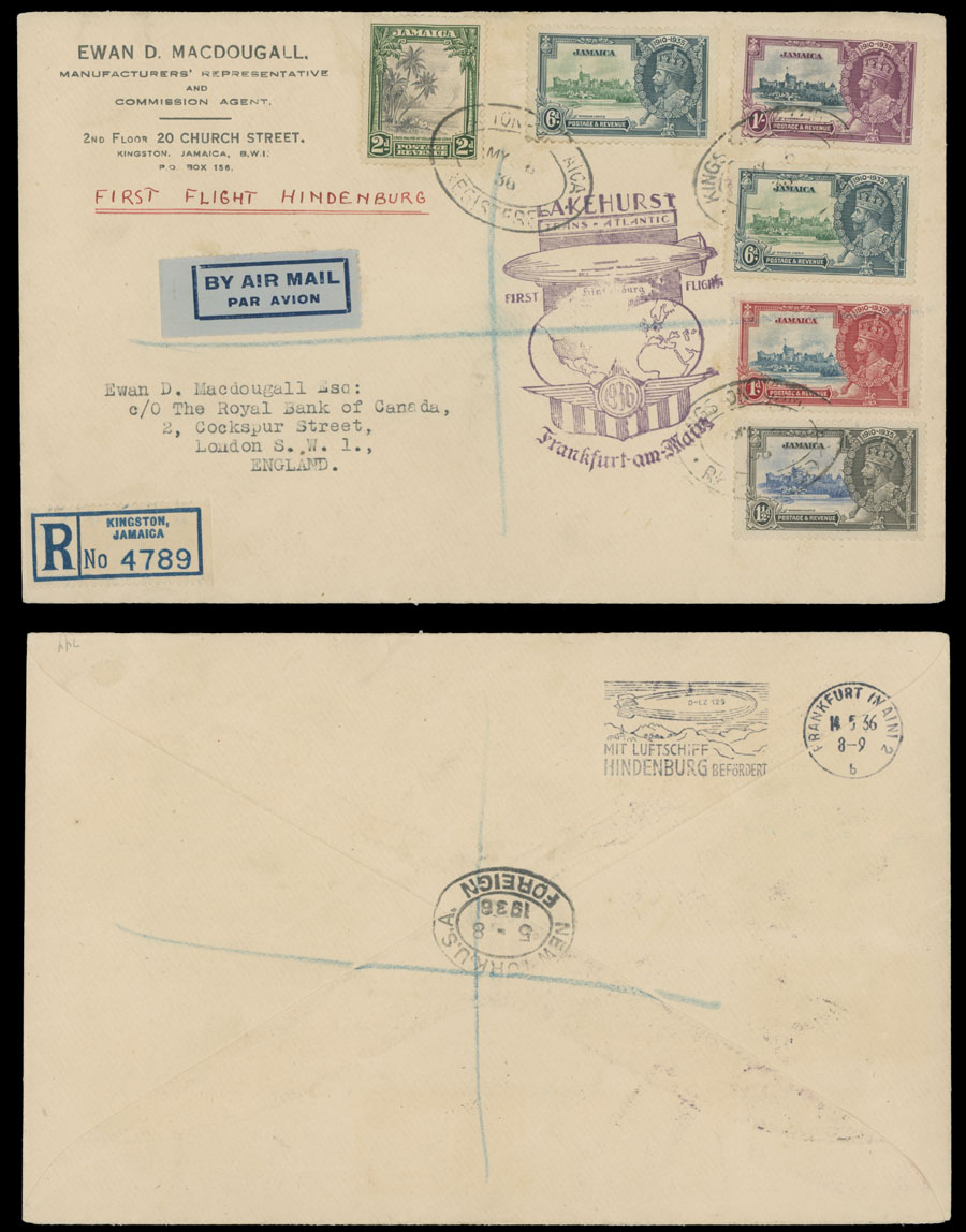 1936 (May 11-14), 1st North America Airship ”Hindenburg” Return Flight registered cover from Kingston, franked by six stamps, including complete set of King George V Silver Jubilee issue, tied by oval ”MY.5.36” ds, violet American confirmation cachet, machine Frankfurt ”14.5.36” arrival marking, VF and rare, Sieger #409S, C.v. €1,500, Est. $600-$700, Scott #106, 109‑12