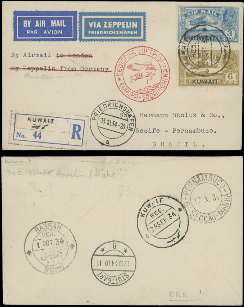 1934 (October 13-17), 10th SAF registered cover from Kuwait, franked by two air post values, Basrah (1.OCT.34), Stuttgart (12.10.34) transits on reverse, Friedrichshafen ”13.10.34” connection, red letter ”c” Flight marking, Pernambuco ”17.X.34” arrival ds, VF and very rare, Sieger #280, €1,100, Est. $800-$900, Scott #C2, C4