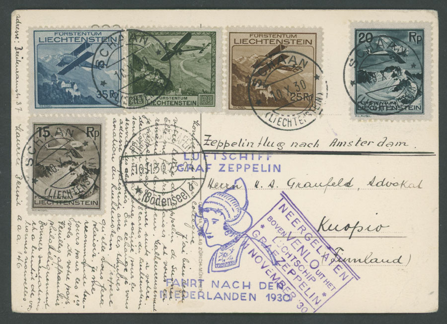 1930 (November 11), Netherlands Flight postcard, franked by 5 air post stamps of the first issue (C.v. $273 for stamps on cover), tied by Schaan ds, Friedrichshafen ”10.11.30” connection, blue and violet confirmation markings, mostly VF, Sieger #98, C.v. $217.50 for stamps off cover, Est. $150-$180, Scott #C1-5