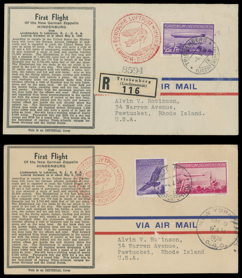 1936 (May 6-9), Airship ”Hindenburg” 1st North America Flight pre-printed with ”The New German Zeppelin Hindenburg” details postcard and registered cover from Triesenberg, franked by 1fr and 2fr Zeppelin stamps, red letter ”d” (Frankfurt) flight marking, NYC ”5.9.1936” arrival ds, VF, Sieger #408A, B, C.v. €250, Est. $150-$180, Scott #C15-16