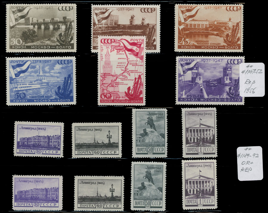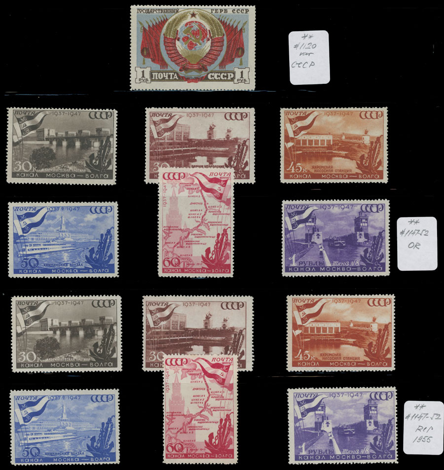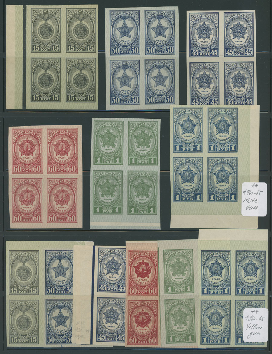 SELECTION OF POST-WORLD WAR II ISSUES AND VARIETIES: 1945 -48, Military Orders and Medals, two sets of blocks, yellow and white gum, Soviet Coat of Arms, joined letters ”C”, ”Moscow – Volga” Canal, three sets, first issue and two re-issues, View of Leningrad, two sets, first issue and re-issue, all with full OG, NH, mostly VF, Est. $200-$250, Scott #960/ 1192, var