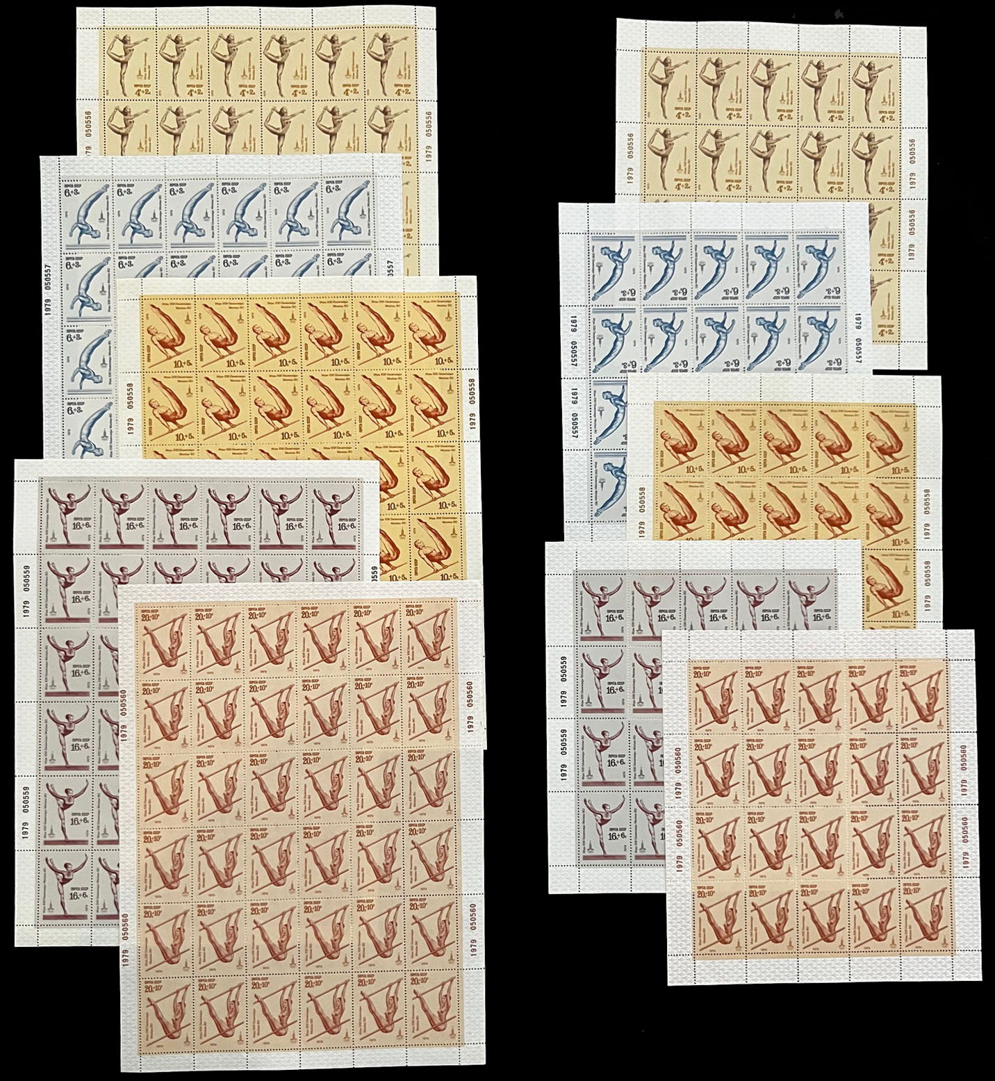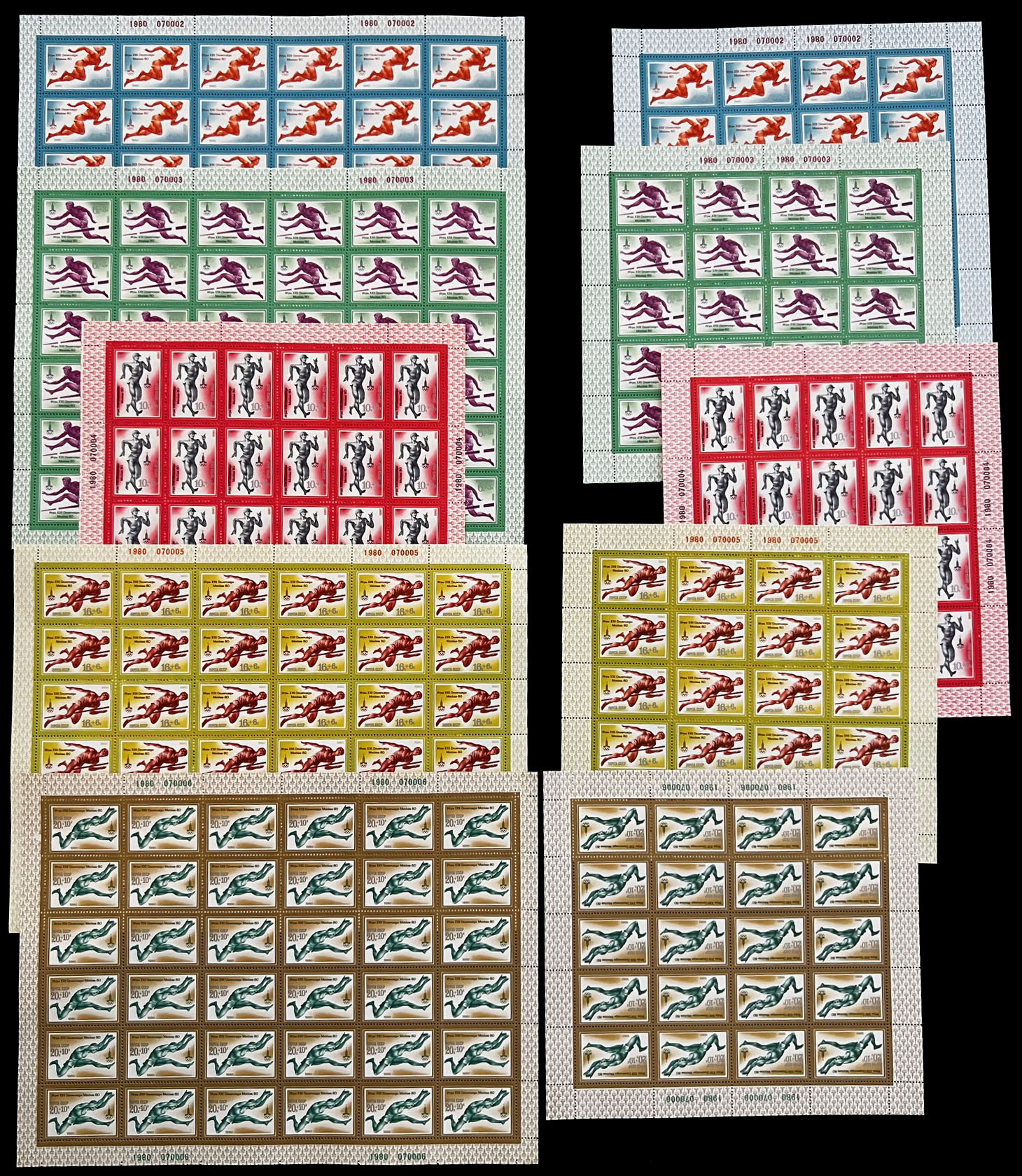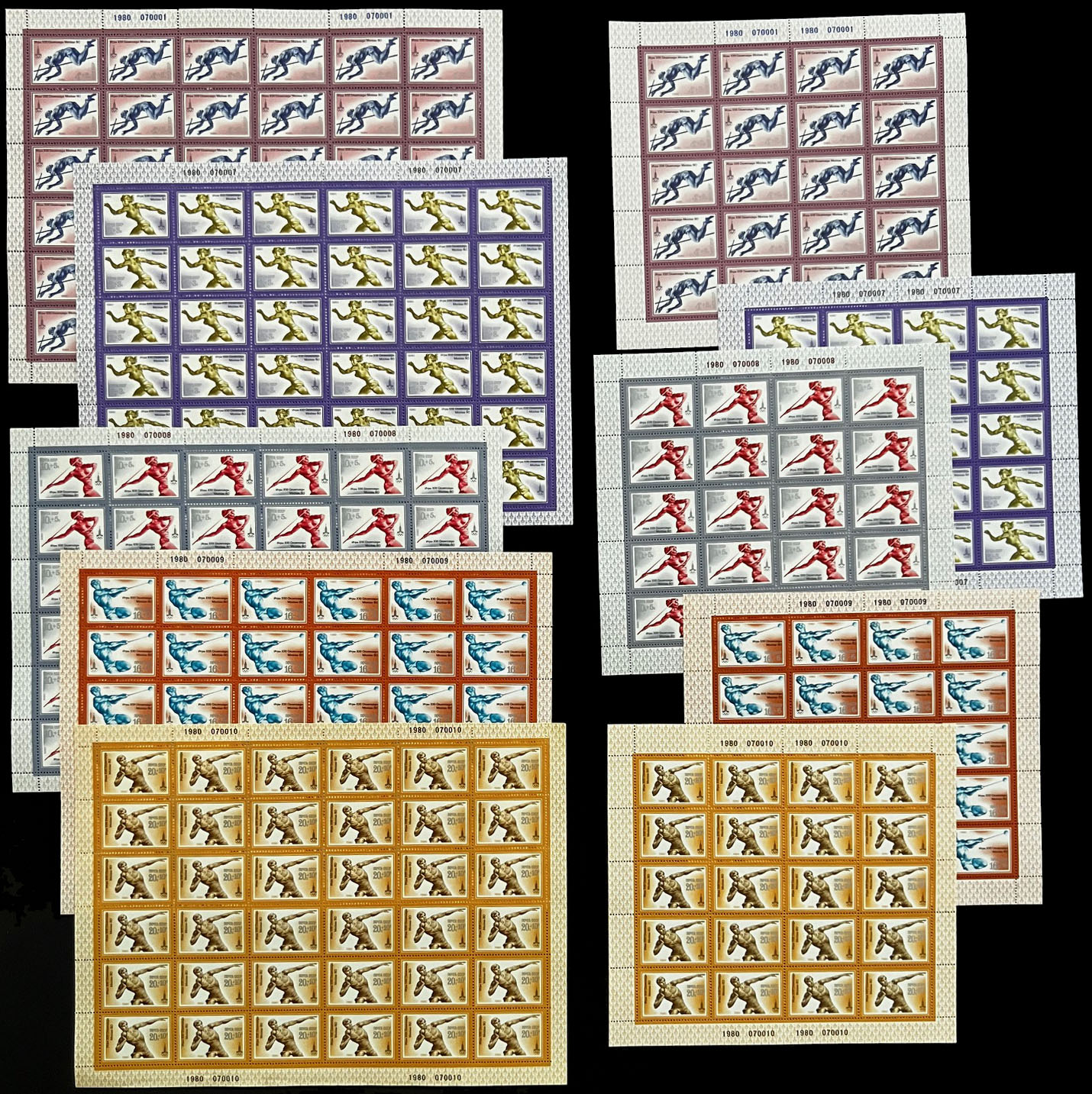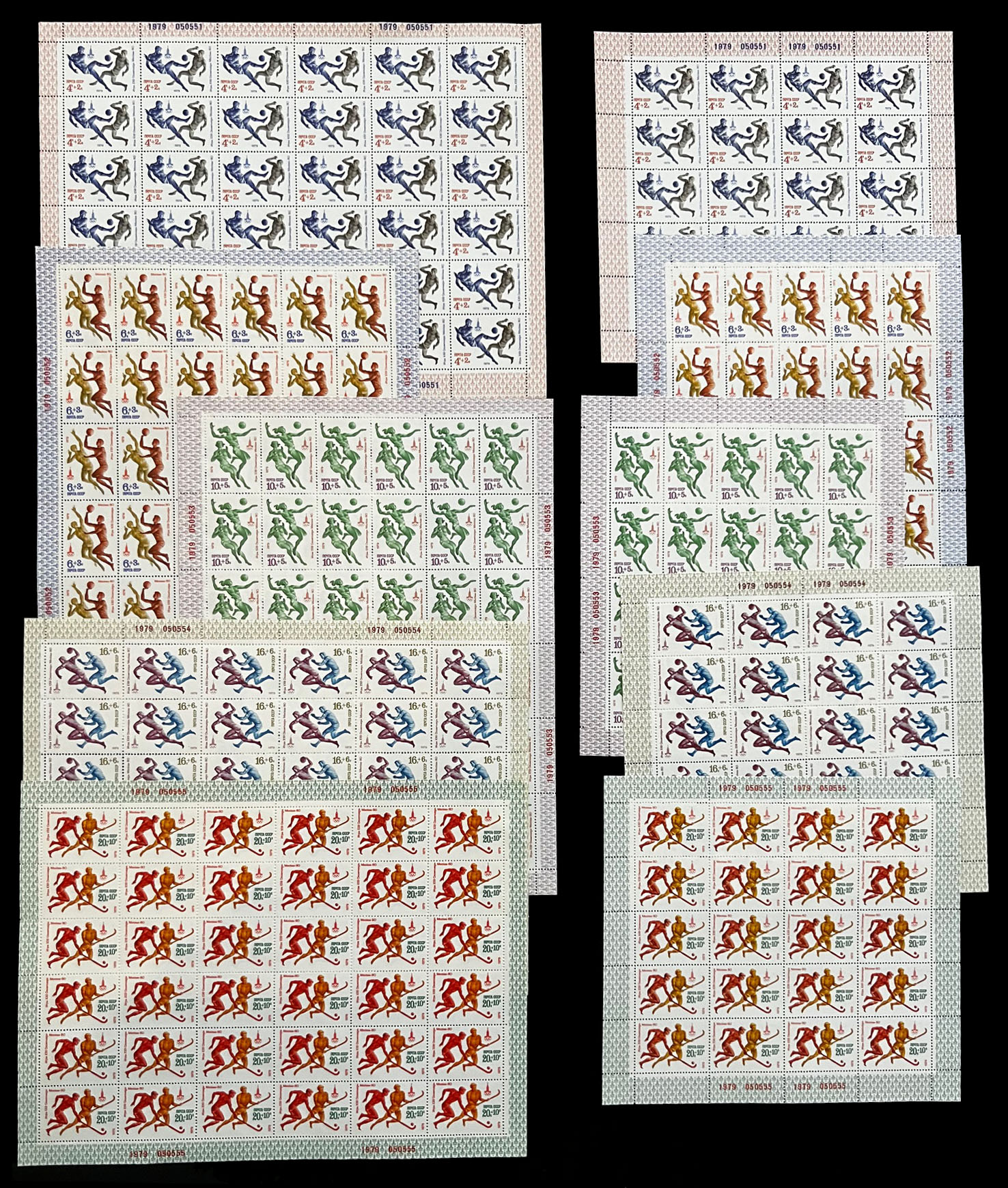 MOSCOW OLYMPIC GAMES – SPORTS ISSUES: 1977-80, 37 large sheets of 36 (1 sheet – CTO) and 40 miniature sheets of 20, eight complete issues of five stamps each, full OG, NH, VF, Est. $200-$250 , Scott #B62/ B105, var