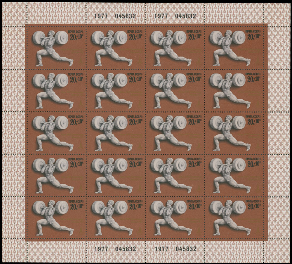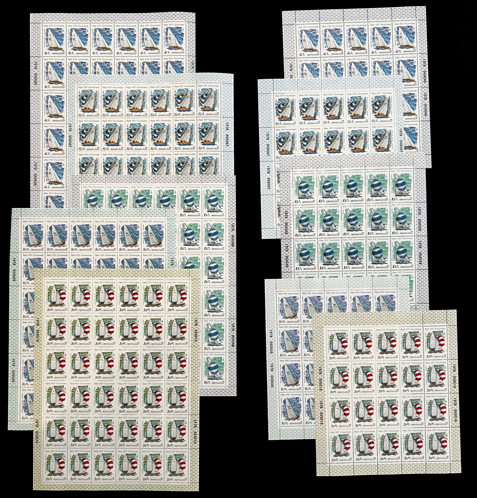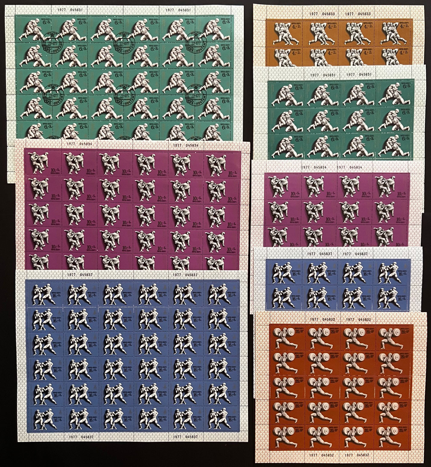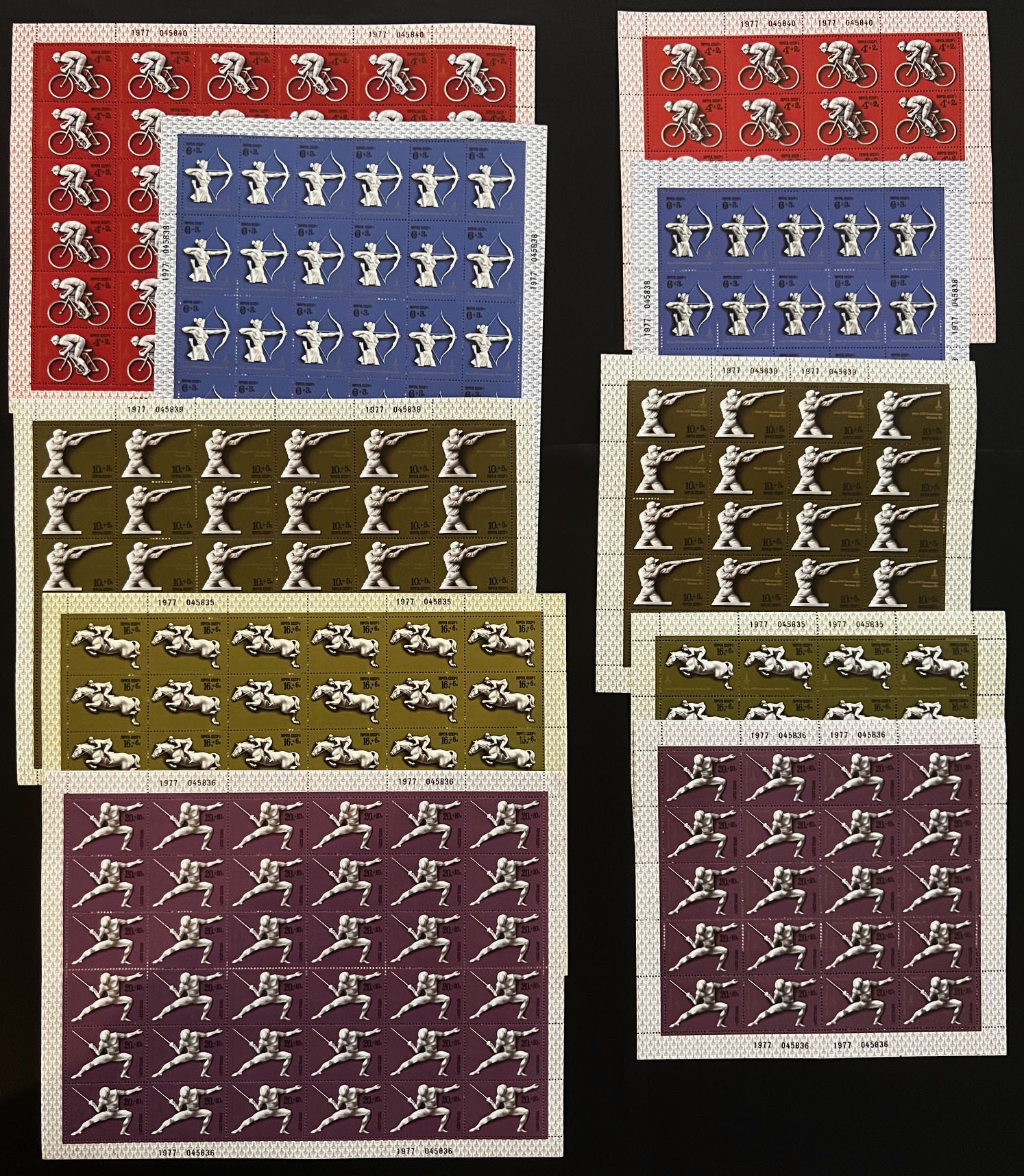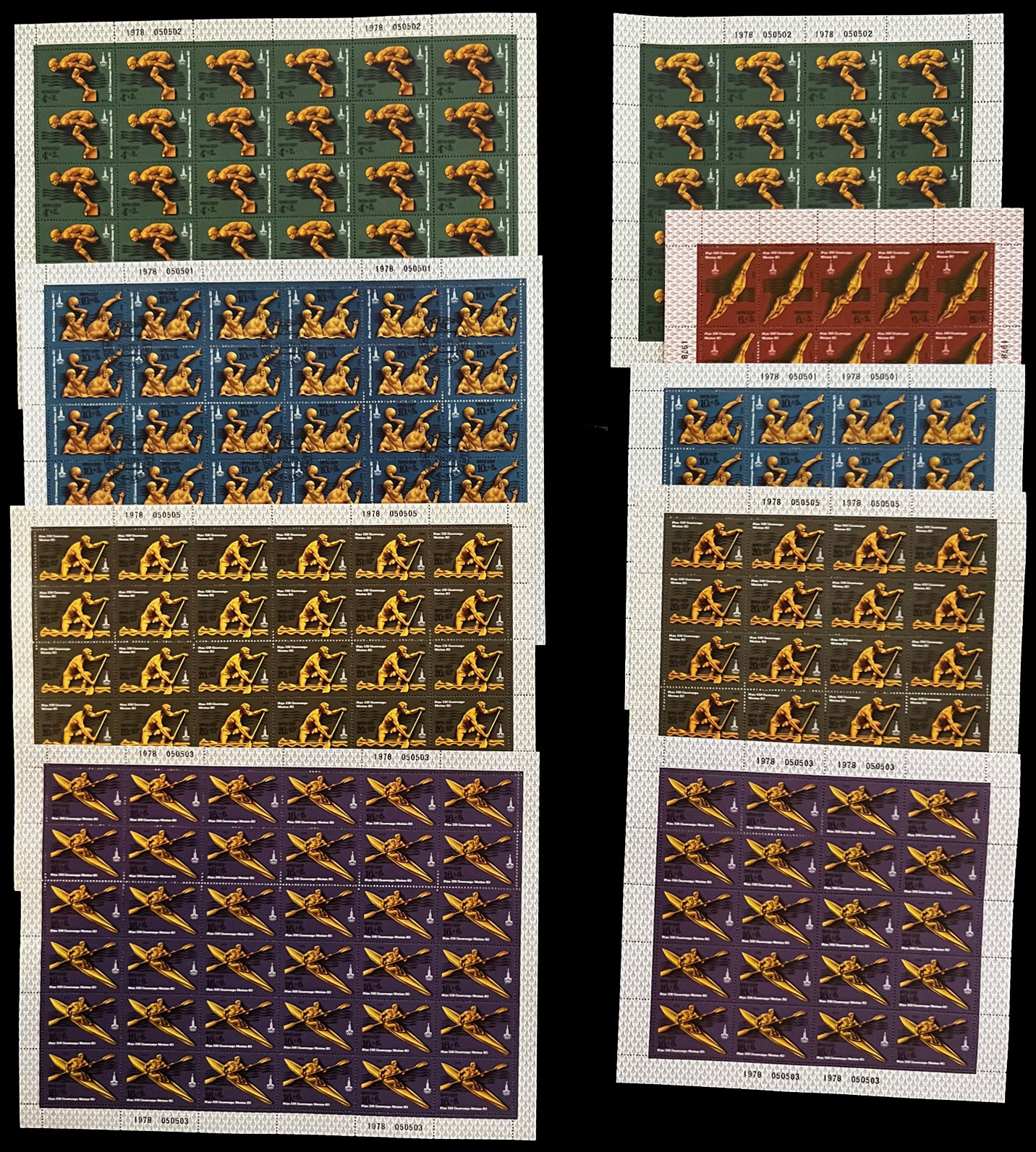 MOSCOW OLYMPIC GAMES – SPORTS ISSUES: 1977-80, 37 large sheets of 36 (1 sheet – CTO) and 40 miniature sheets of 20, eight complete issues of five stamps each, full OG, NH, VF, Est. $200-$250 , Scott #B62/ B105, var