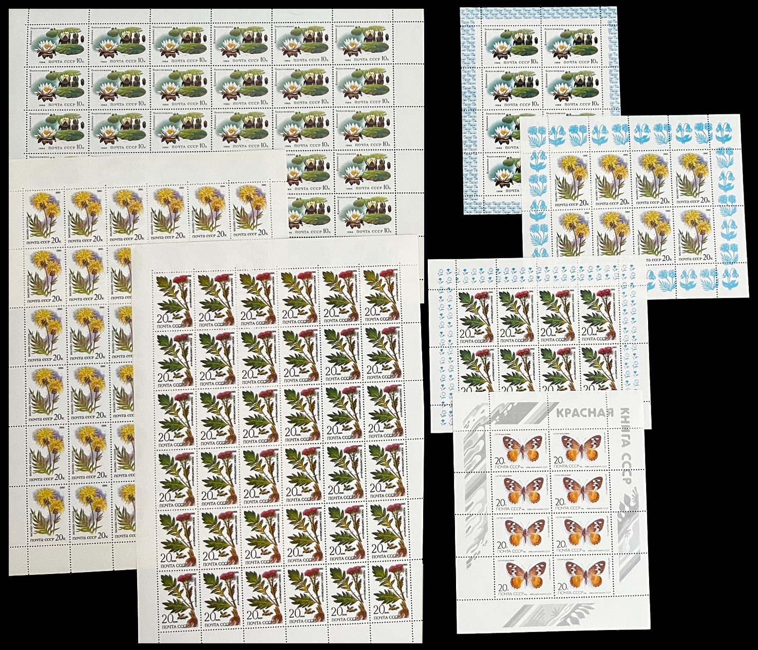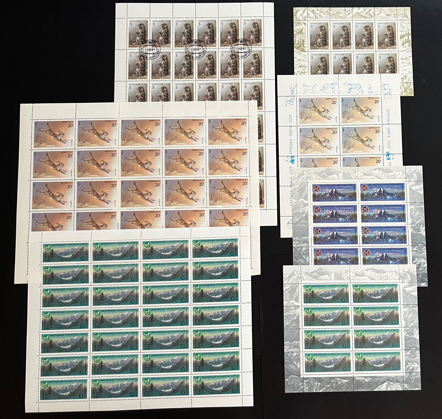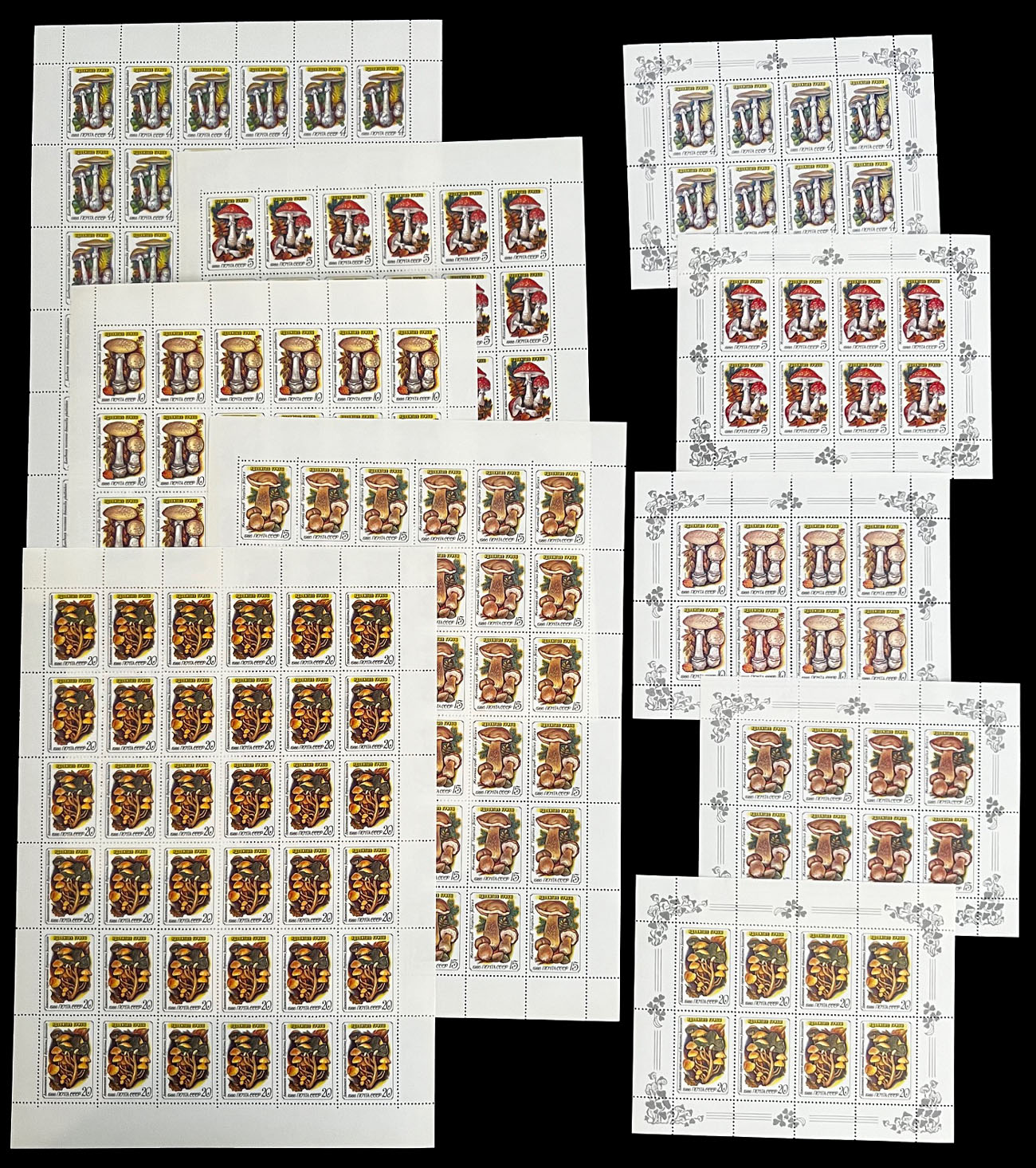 NATURE – TOPICAL ISSUES: 1984-91, 21 large sheets (1-CTO) and 21 miniature sheets, representing 11 sheets printed in limited quantity, including WWF Polar Bears, Water-Lily, Rhaponticum and Cornflower, Caracal and Marmot, Butterfly and Alpine Camp, in addition common miniature sheets – Mushrooms, Ducks and etc., post office fresh quality, full OG, NH, VF, Est. $500-$600, Scott #5254/ 6011, a, var