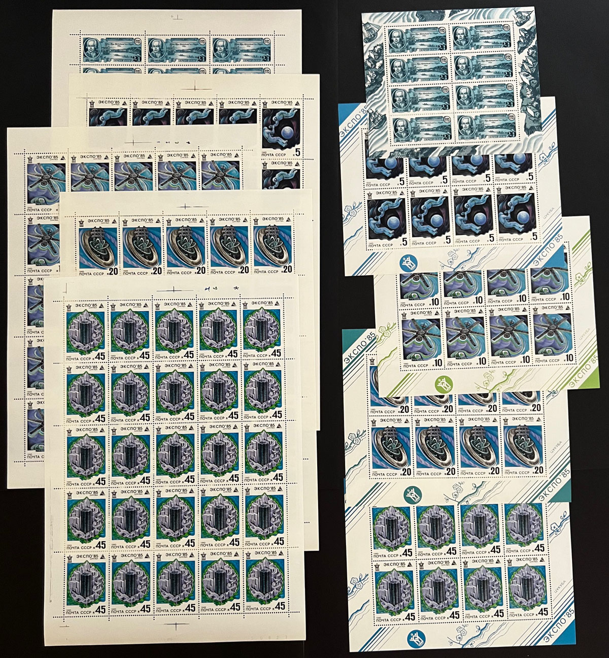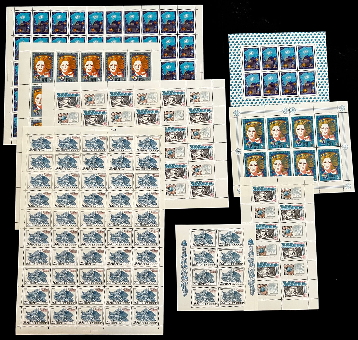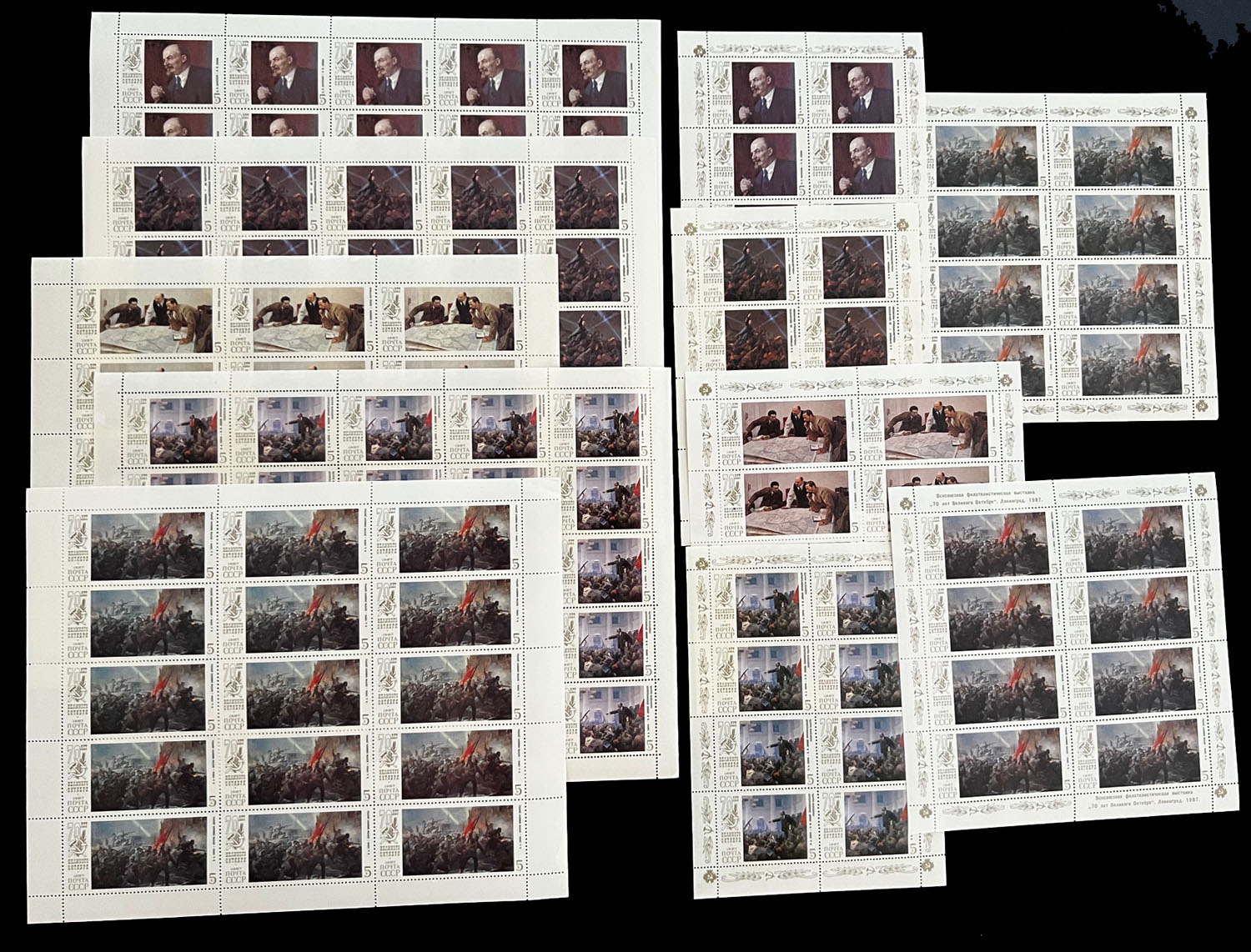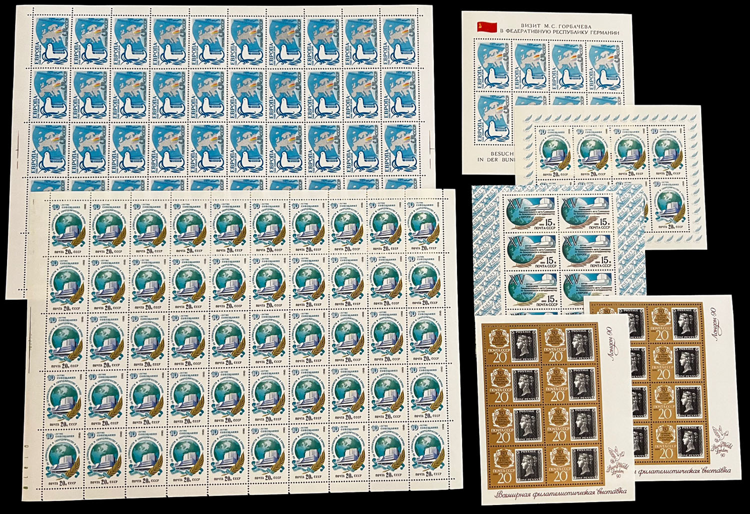 HISTORICAL DATES AND POLITICAL VENUES – TOPICAL ISSUES: 1982-91, 22 large and 34 miniature sheets, starting with Lenin 100th birth Anniversary, including UN Conference (1982), EXPO’ 85 in Japan (4 sheets), Helsinki Conference, Red Cross, the total is 7 sheets issued in limited quantity, in addition Youth Festival in Moscow, 40th Anniversary of the Victory in WWII, 150th Anniversary of the Black Penny and etc., full OG, NH, VF, Est. $150-$200, Scott #3721/ 5971, a, var