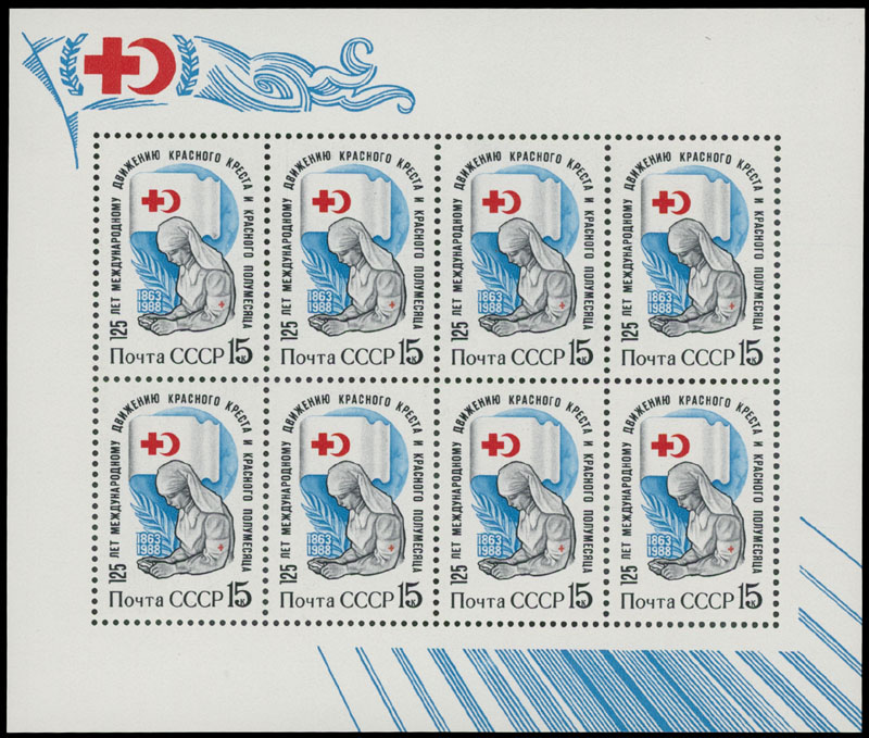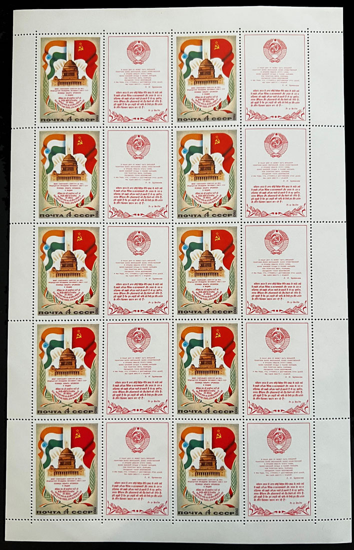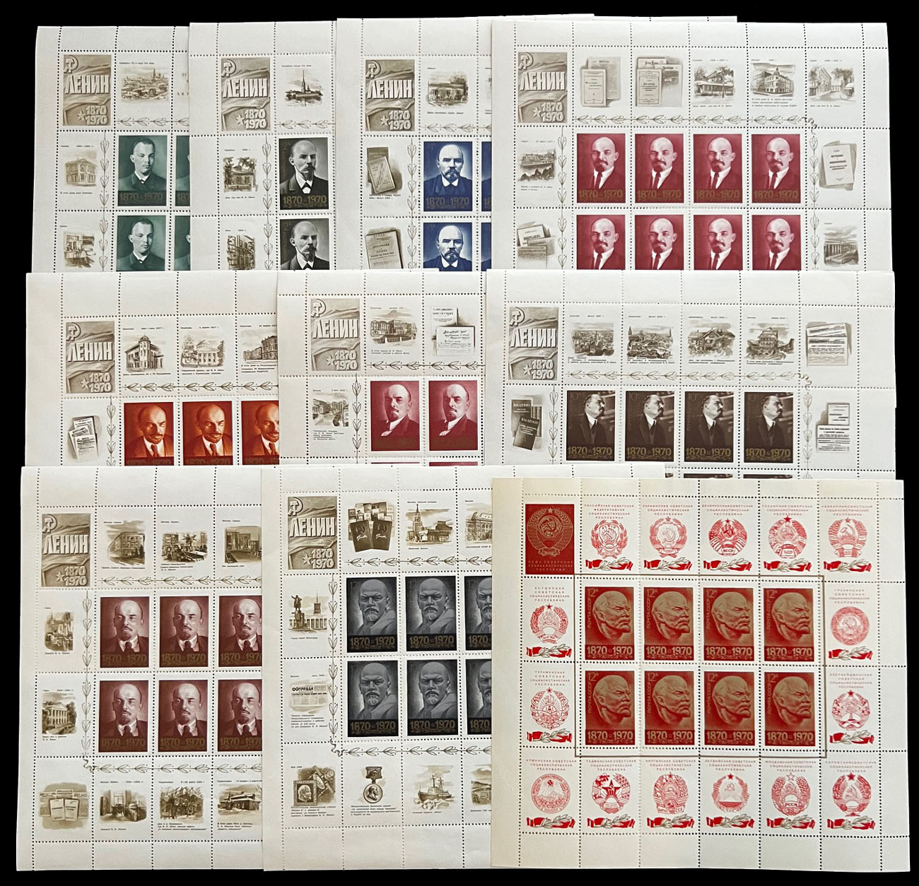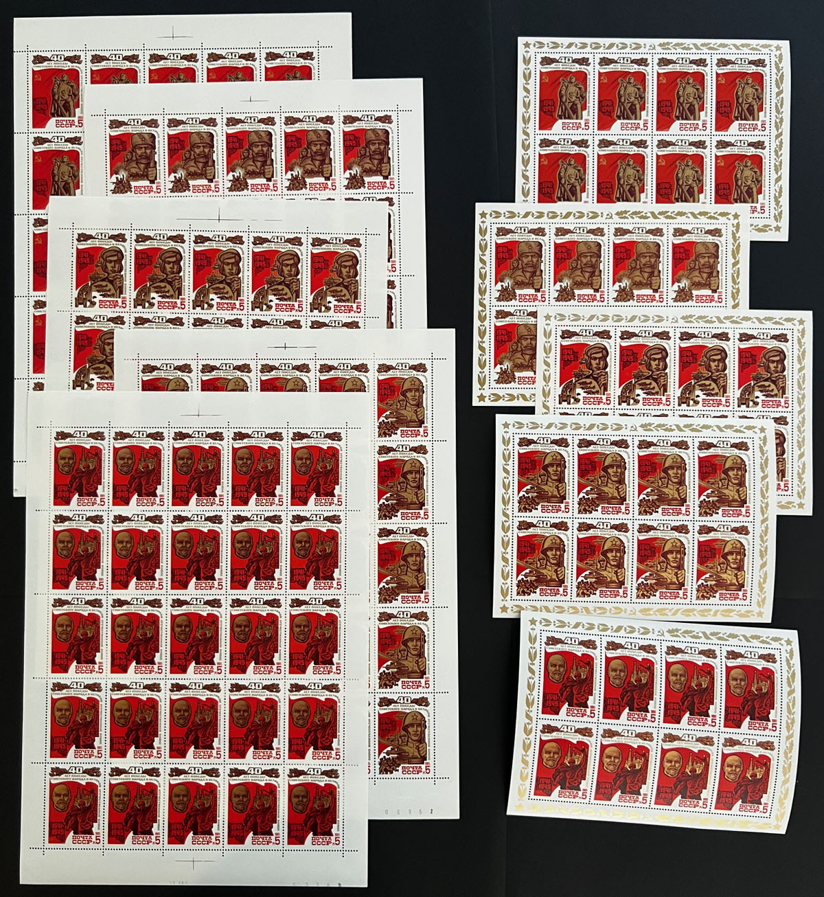 HISTORICAL DATES AND POLITICAL VENUES – TOPICAL ISSUES: 1982-91, 22 large and 34 miniature sheets, starting with Lenin 100th birth Anniversary, including UN Conference (1982), EXPO’ 85 in Japan (4 sheets), Helsinki Conference, Red Cross, the total is 7 sheets issued in limited quantity, in addition Youth Festival in Moscow, 40th Anniversary of the Victory in WWII, 150th Anniversary of the Black Penny and etc., full OG, NH, VF, Est. $150-$200, Scott #3721/ 5971, a, var