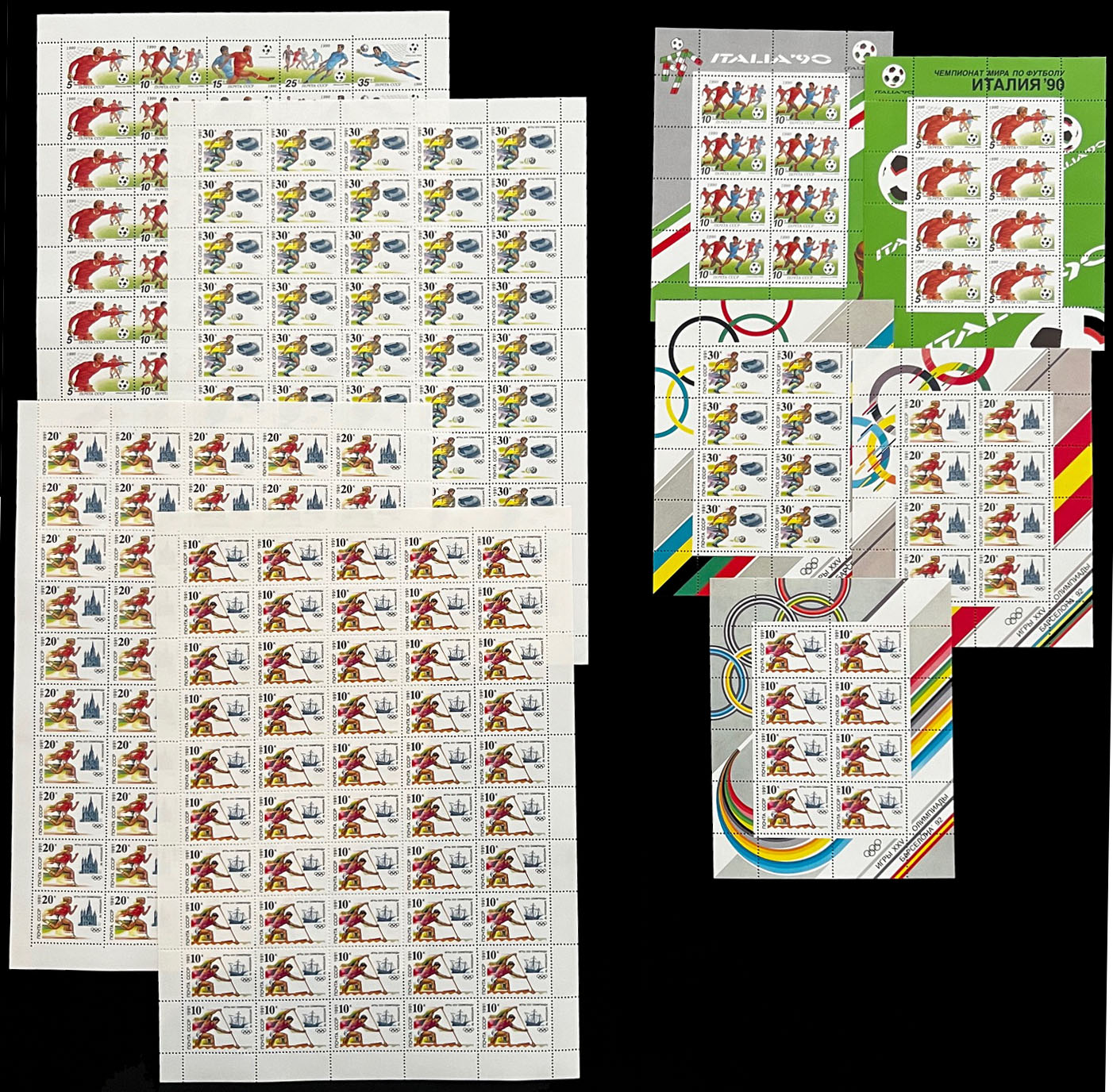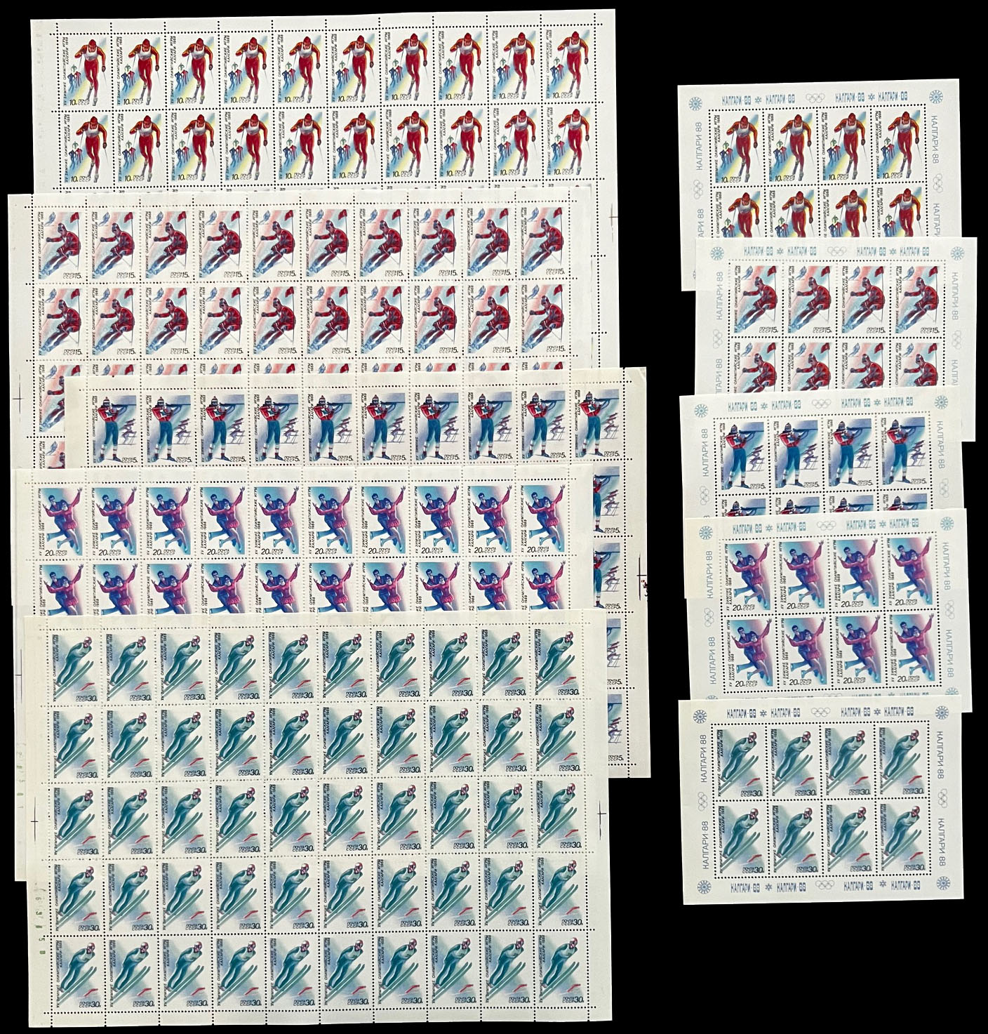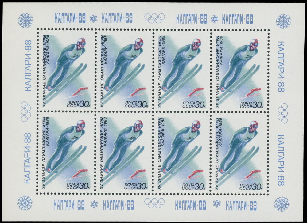 OLYMPIC GAMES AND SPORTS – TOPICAL ISSUES: 1980-91, 27 large and 29 miniature sheets, including Olympic Games in Lake Placid (1980 – 5), Sarajevo (1984 – 4), Calgary (1988 – 5), Seoul (1988 – 5), Soccer World Cup of 1982 and 1986 (3), the total is 23 sheets were printed in limited quantity, full OG, NH, VF, Est. $400-$500, Scott #4807/ 6025, a, var