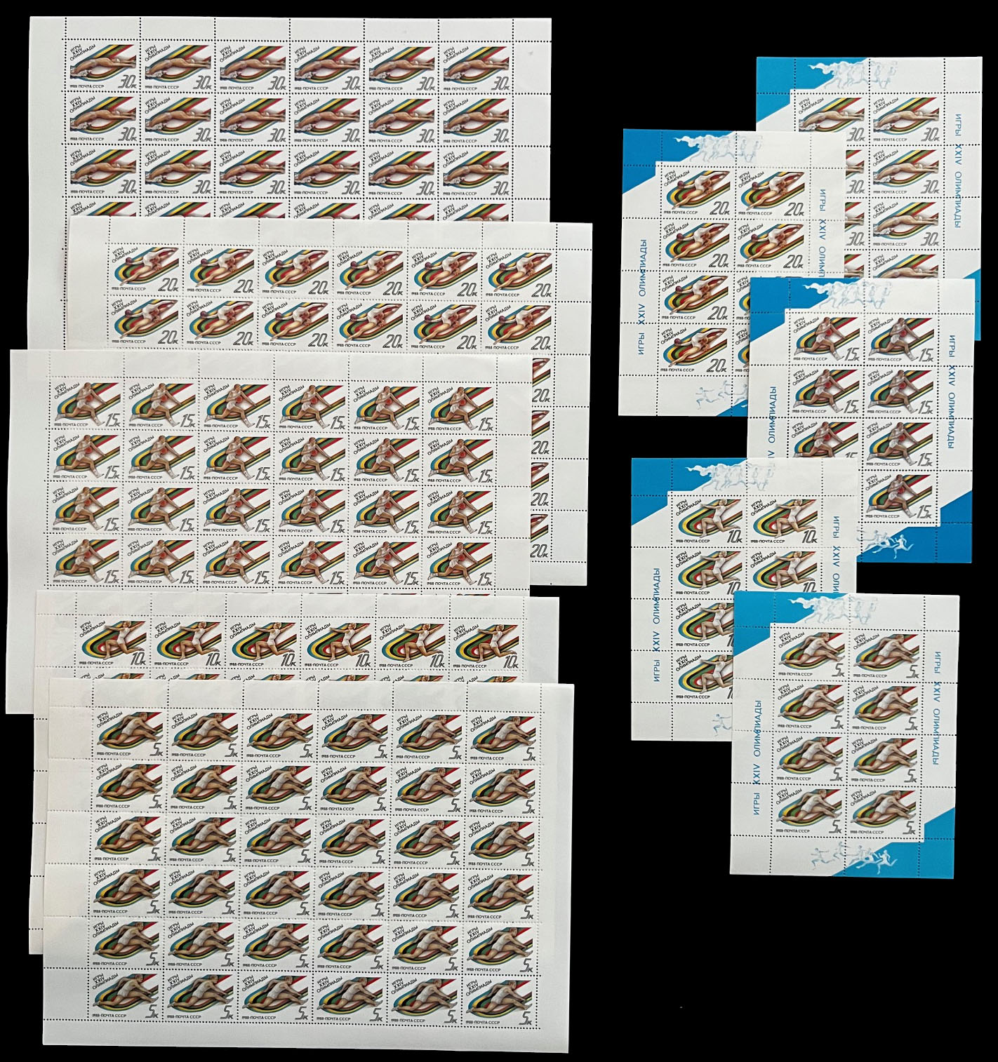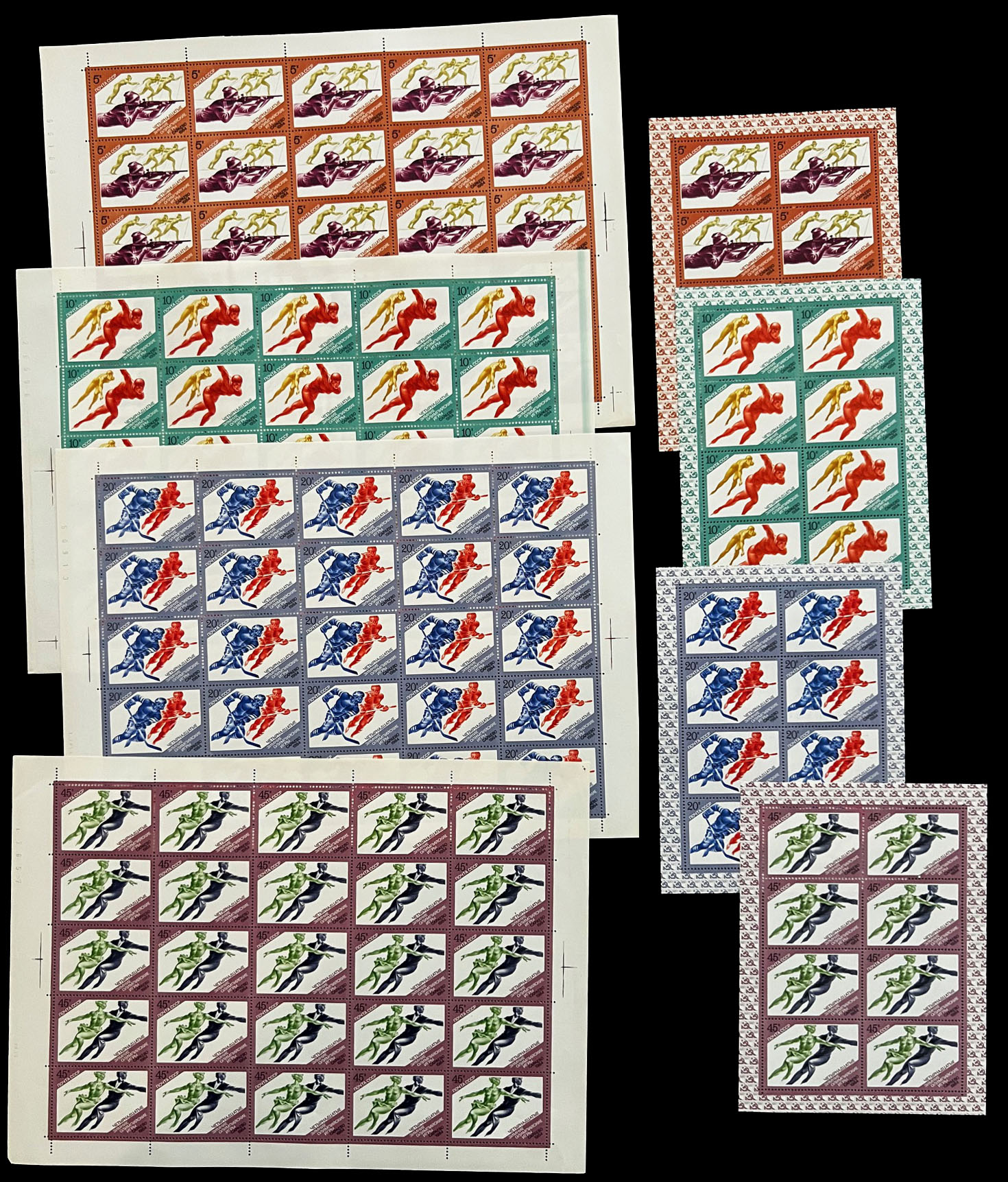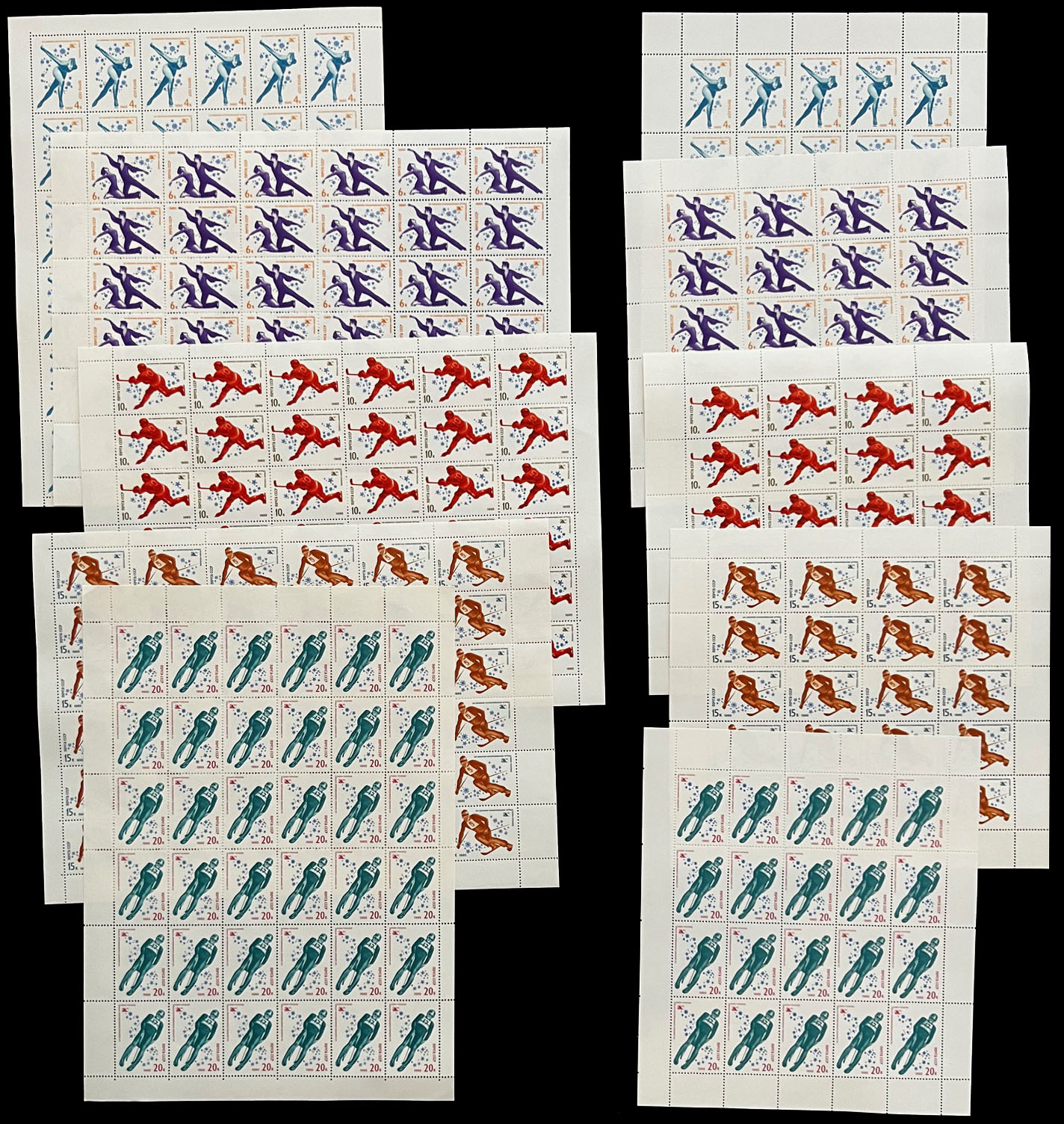 OLYMPIC GAMES AND SPORTS – TOPICAL ISSUES: 1980-91, 27 large and 29 miniature sheets, including Olympic Games in Lake Placid (1980 – 5), Sarajevo (1984 – 4), Calgary (1988 – 5), Seoul (1988 – 5), Soccer World Cup of 1982 and 1986 (3), the total is 23 sheets were printed in limited quantity, full OG, NH, VF, Est. $400-$500, Scott #4807/ 6025, a, var