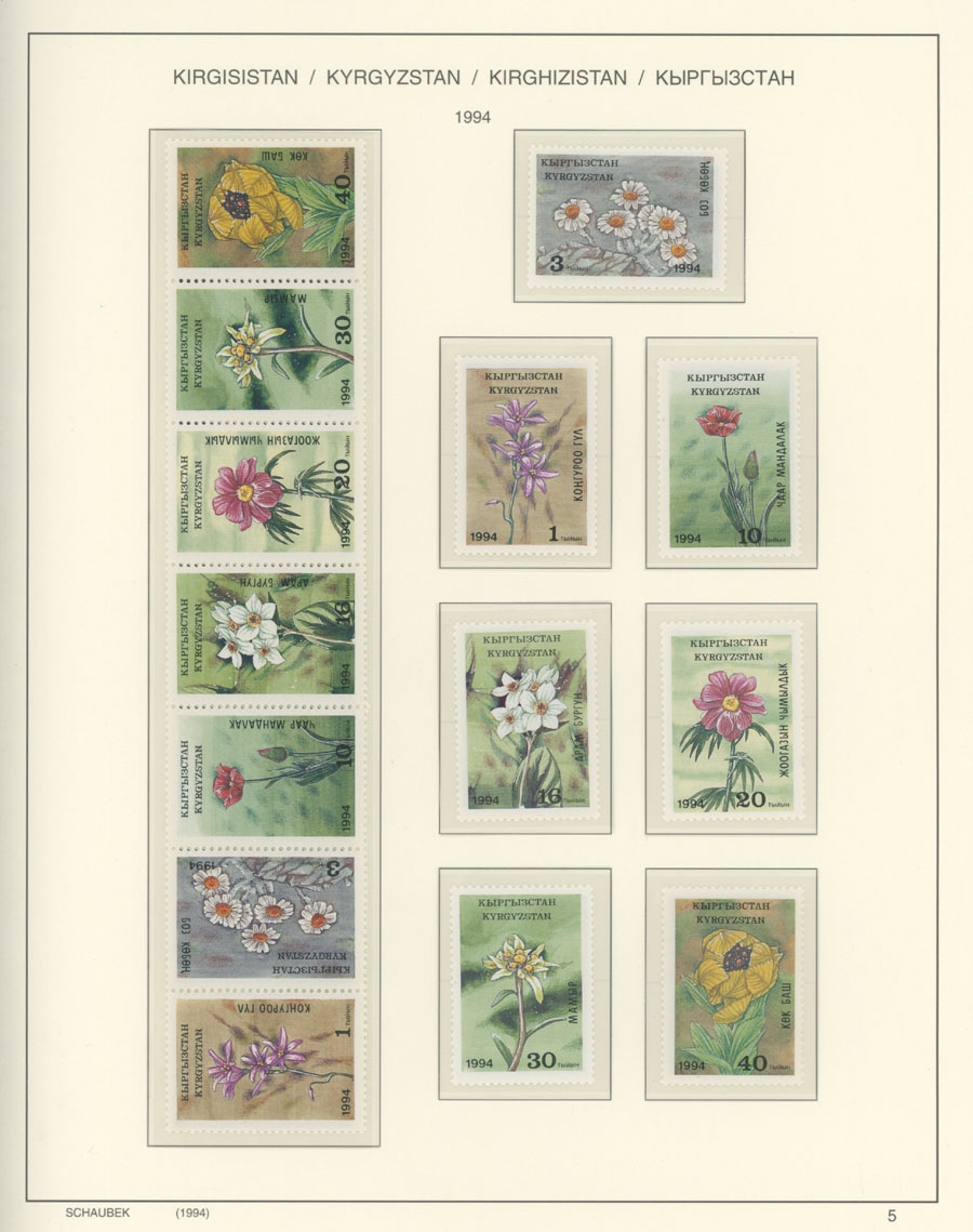 LARGE COLLECTION: 1992-2000, over 1300 stamps and about 250 souvenir and miniature sheets, representing issues of Belarus, Georgia, Kazakhstan, Kyrgyzstan, Tajikistan, Ukraine and Uzbekistan, in addition Soviet and Russian Federation material from 1964-2000, representing 40 stamps and over 100 souvenir and miniature sheets, nice quality unit housed in two Scott albums and a stockbook, full OG, NH, mostly VF, Est. $600-$800