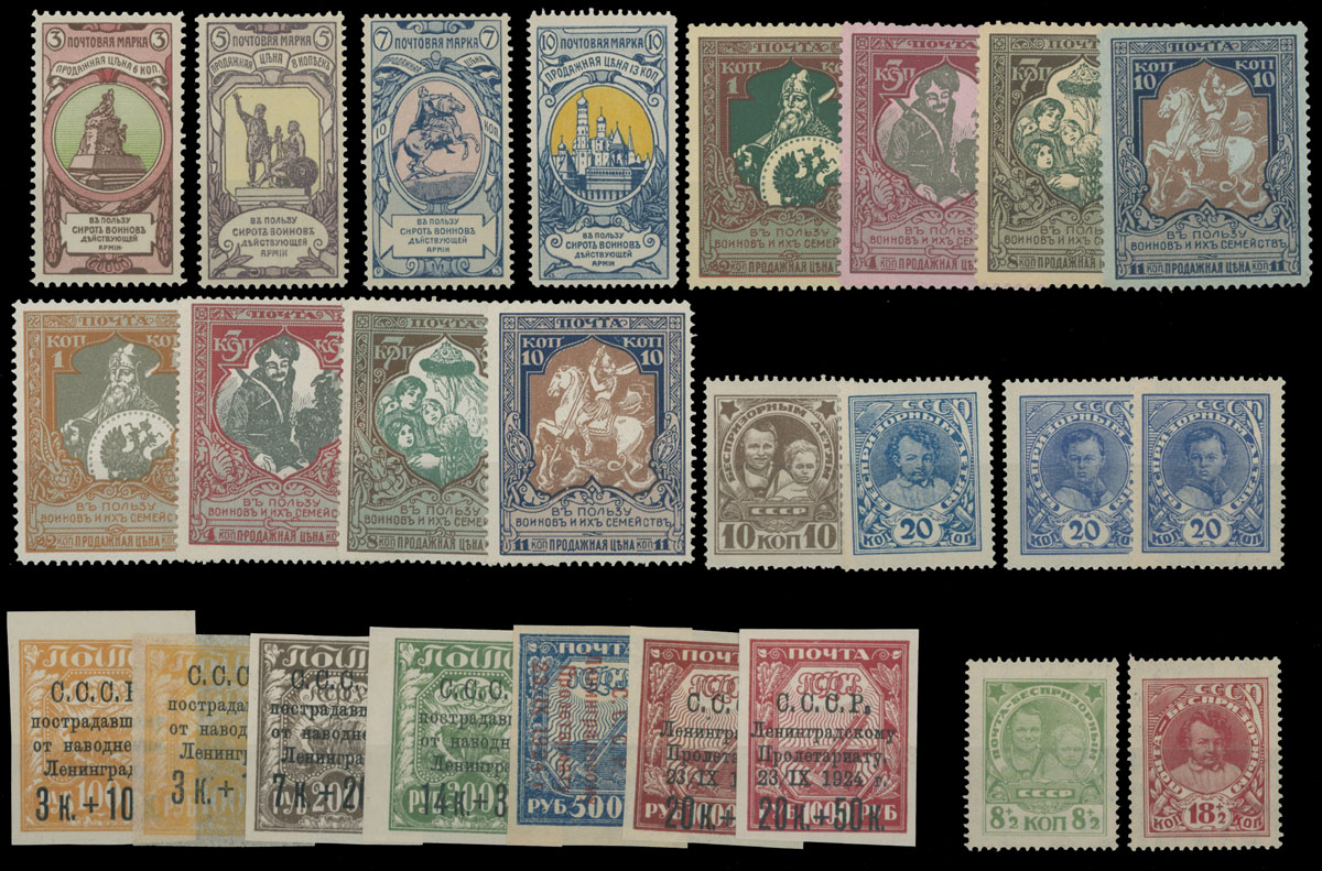 1905-27, Russo-Japanese and World War I Charity issues, Leningrad Flood issue, Child Welfare sets including unissued Pioneer on watermarked and not watermarked paper, the total is 7 issues, all with full OG, NH, VF, Est. $200-$250 , Scott #B1/B50