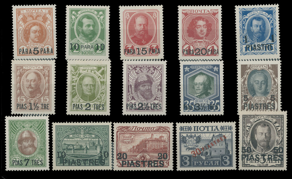 1913, Romanov Dynasty, black or red surcharges 5pa/1k – 50pi/5r, complete set of 15, full OG, NH (most of low values, 20pi/2r and 30pi/3r), VF, C.v. $178 as hinged, Est. $120-$150 , Scott #213-27