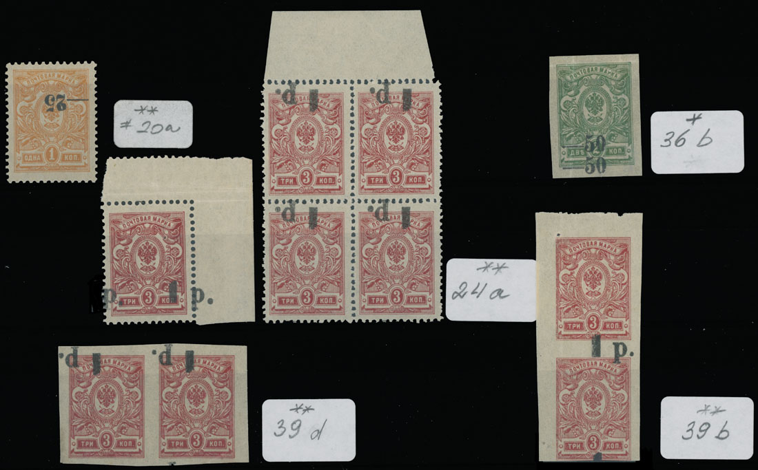 1918-20, 11 mint stamps in singles, pairs and block of four, including ten inverted surcharges, one double and three surcharge shifts, No.36b has gum crease, sound condition overall, full OG, NH, VF and guaranteed genuine, C.v. $545++, Est. $150-$180, Scott #20a/36d