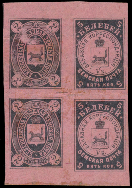 1897, Coat of Arms, imperforate proofs of 2k and 5k in black, se-tenant block of four, printed on rose thin paper, top left stamp with facial scratch, horizontal fold between stamps, otherwise full original soiled gum, F/VF and very scarce multiple, Chuchin #4-5, Schmidt #4- 5, Est. $300-$350