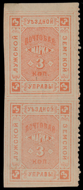 1886, 3k rose red, vertical pair imperforated horizontally and vertically on the left, slight fold between stamps, full OG, previously hinged, VF and an interesting error, Chuchin #13 var, Schmidt #13 var, Est. $100-$120