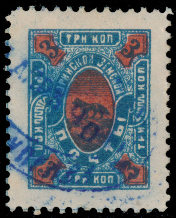 1890, 3k blue and red, tied by blue oval zemstvo cancellation with missing year, ”90” endorsed by hand into date stamp, nice quality, VF and very scarce, Chuchin #23 var, Schmidt #25 var, C.v. $140++, Est. $150-$180