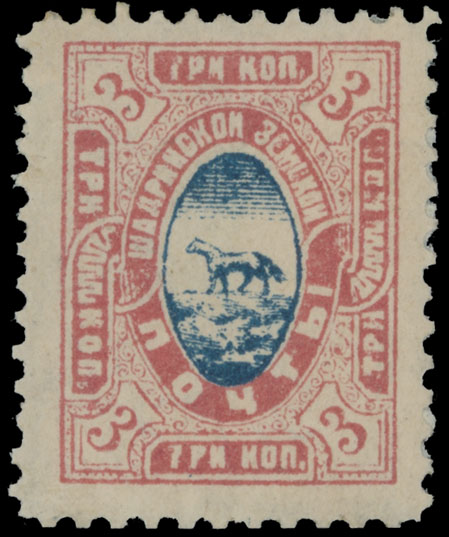 1890, 3k rose red and blue, all ”kop” with a period, part of OG, VF, Chuchin #26, Schmidt #28, rank ”R”, Est. $120-$150
