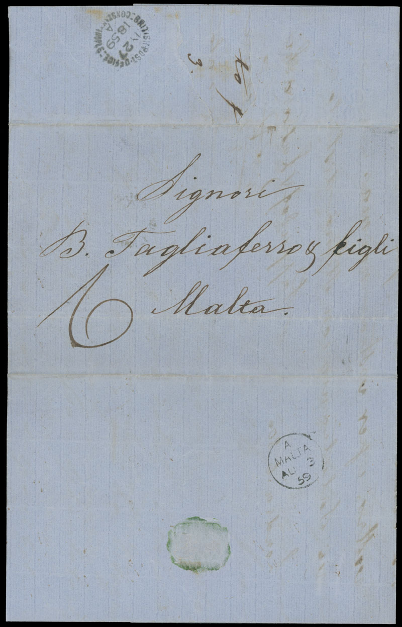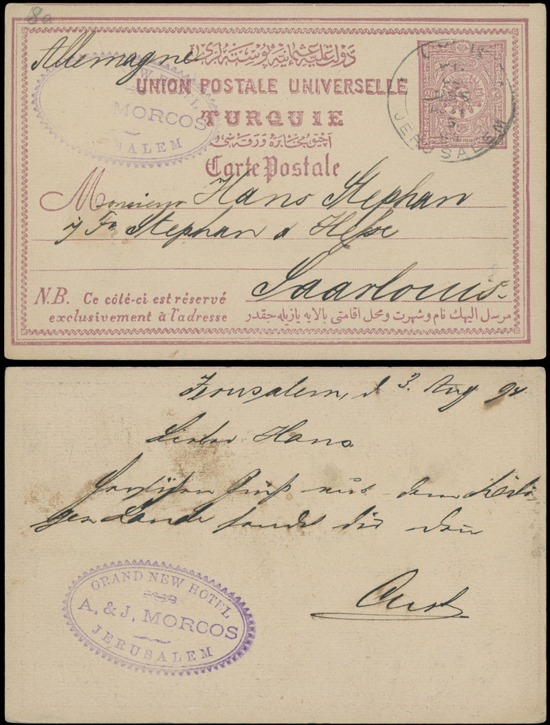 1859-94, two items – stampless entire letter from British PO in Turkish Empire to Malta and stationery postcard 20pa lilac sent from Jerusalem to Germany, appropriate markings, VF, Est. $200-$250