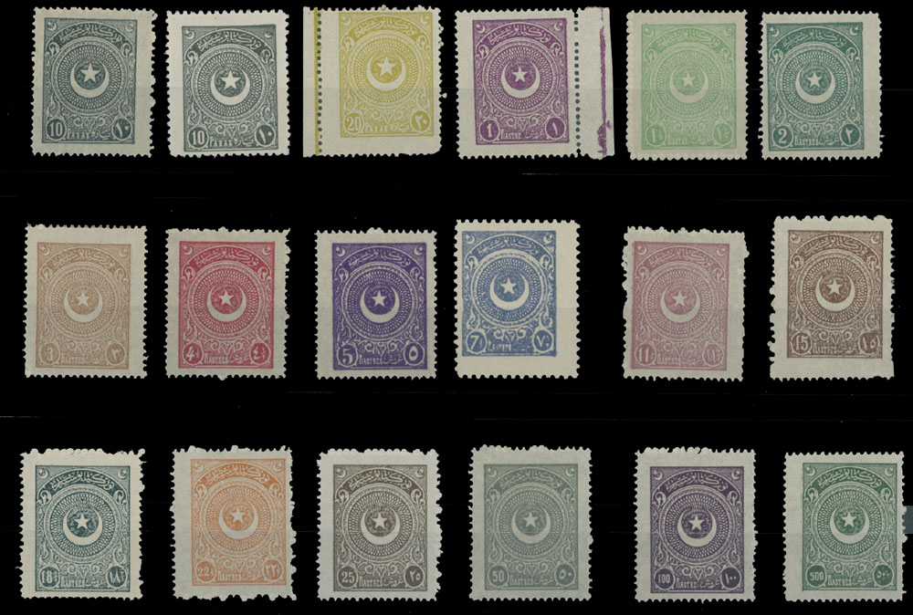 1923, Crescent and Star, 10pa-500pi, set of 18 (less 3¾pi and 10pi, C.v. $15), most with perforation 13¼x12¾, full OG, mainly LH, F/VF, C.v. $1,420, Est. $300-$400 , Scott #605/23, var