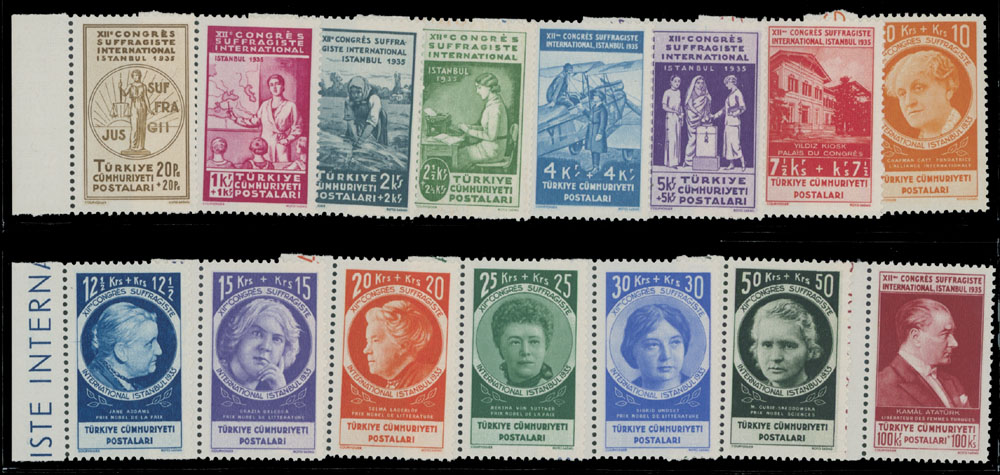 1935, Suffragists’ Congress, 20pa +20pa – 100k+100k, complete set of 15, all with left sheet margins, perfect quality, full OG, NH, VF, C.v. $750, Est. $300-$350 , Scott #B54-68