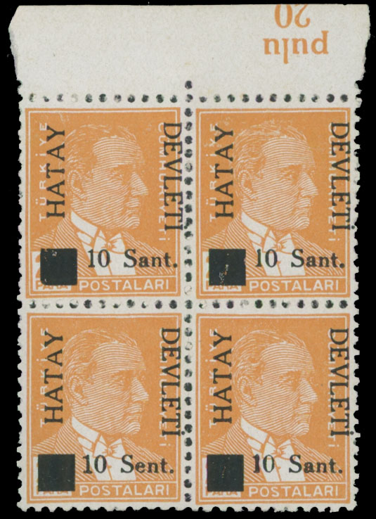 1939, black surcharge 10s on Kemal Ataturk stamp of 10s orange, top sheet margin block of four, lower left stamp with ”Sent” variety, full OG, NH, VF, C.v. $300++, Est. $200-$250 , Scott #1, a