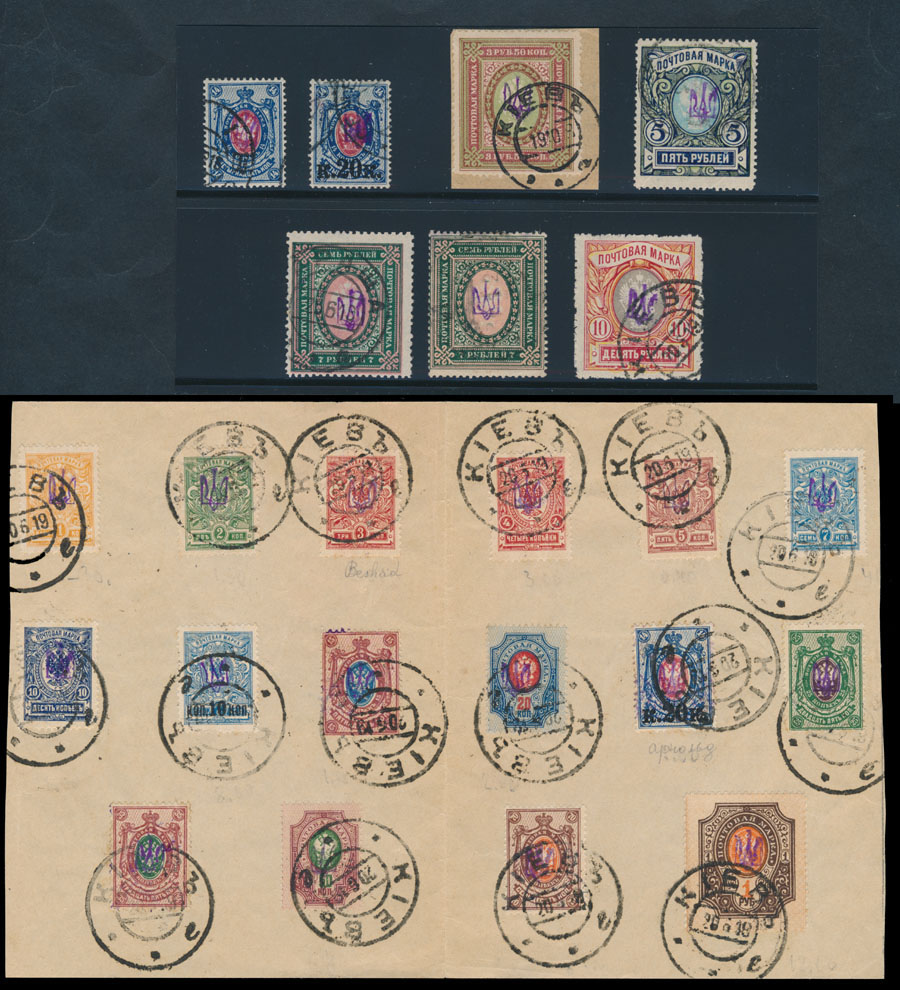 1918, violet overprint (type 1) on perforated 1k-10k, complete set of 23, including both stamps of 7r and Arnold type over 20k on 14k, all are properly cancelled (16 ”kop” values on one piece), fresh and VF, the ”key” stamp expertized by A. Epstein, C.v. $470, Est. $300-$350, Bulat #13-33, 32a, 111