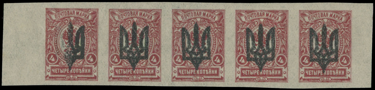 1918, black overprint (type 3B) on imperforate 4k carmine, two-side margin strip of five, first stamp has incomplete trident, full OG, NH (3) or LH, VF, Est. $100-$150 , Bulat #636, var