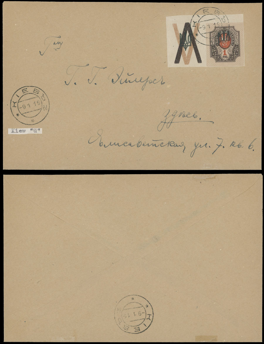 1919, black overprint (type 3B) on 1r brown, pale brown and orange, top left corner margin imperforate stamp with ”V” label, stamp has ”a half trident” variety, used on local cover in Kyiv, backstamped, VF, ex-Dr. Seichter, C.v. $60++ for stamp off cover, Est. $200-$250, Bulat #641c